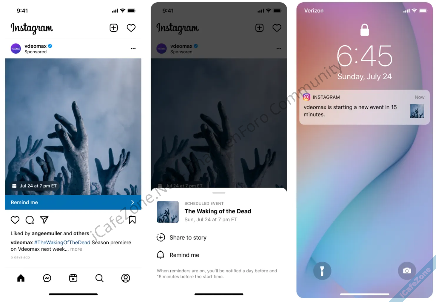 - Reminder Ads เป็นโฆษณาที่แสดงผลในหน้าฟีดผู้ใช้งาน ให้สามารถเลือกกด (opt-in) เพื่อให้ Instagram ส่งแจ้งเตือนเมื่อใกล้ถึงเวลาของอีเวนต์นั้น ซึ่งการแจ้งเตือนจะมี 3 ครั้งคือ 1 วันก่อนถึงเวลา, 15 นาที และขณะเวลานั้น