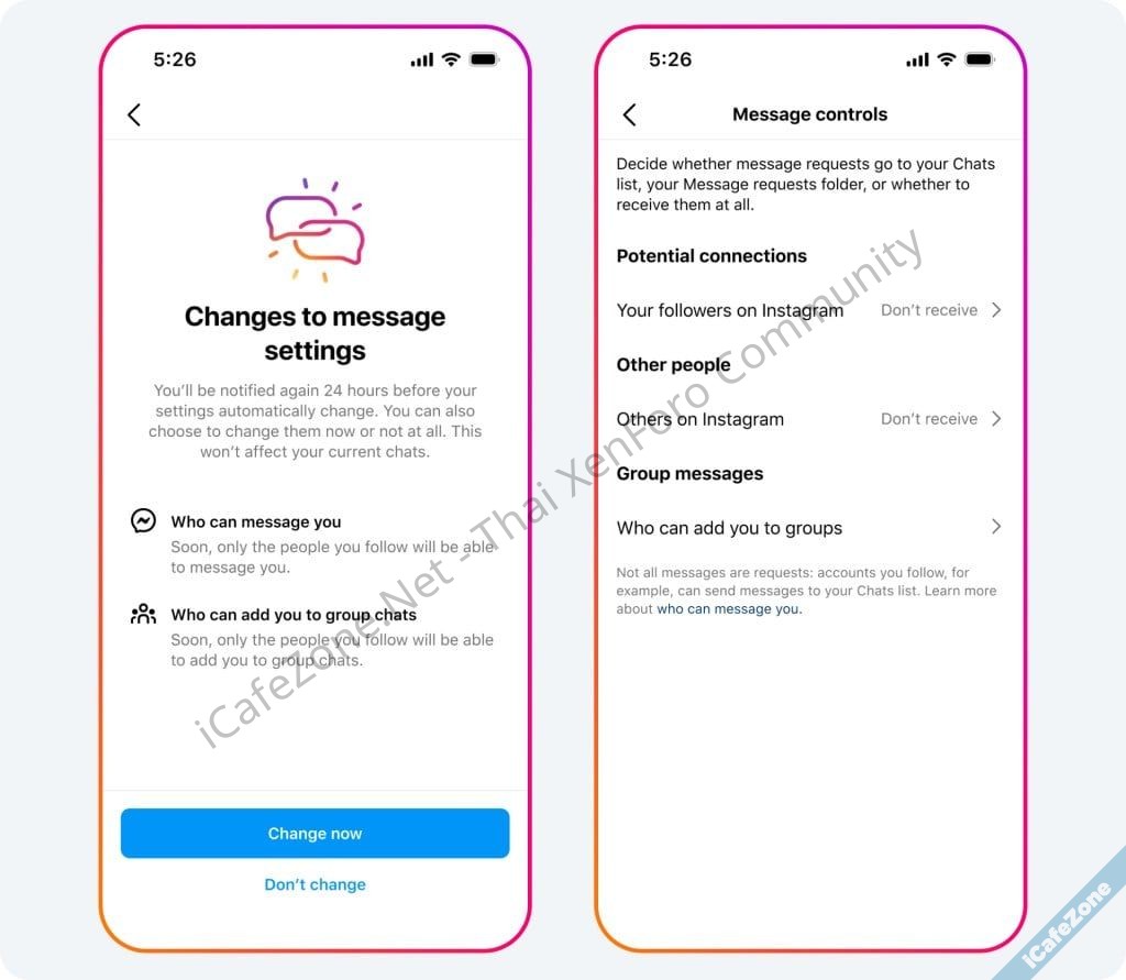 โดยมีผลทันทีตั้งแต่วันนี้ จากเดิมผู้ใหญ่ (อายุ 18 ขึ้นไป) จะไม่สามารถ DM หาวัยรุ่นที่ไม่ได้ติดตามได้ การจำกัดแบบใหม่นี้จะมีผลกับผู้ใช้งานทุกช่วงอายุ โดยผู้ใช้งานอายุต่ำกว่า 16 ปี (หรือ 18 ปี ในบางประเทศ) จะไม่สามารถรับ DM ได้จากคนที่ไม่ได้ติดตาม ไม่ว่าจะอายุเท่าใด การเปลี่ยนแปลงนี้มีผลต่อการถูกดึงเข้ากลุ่มแชทด้วย