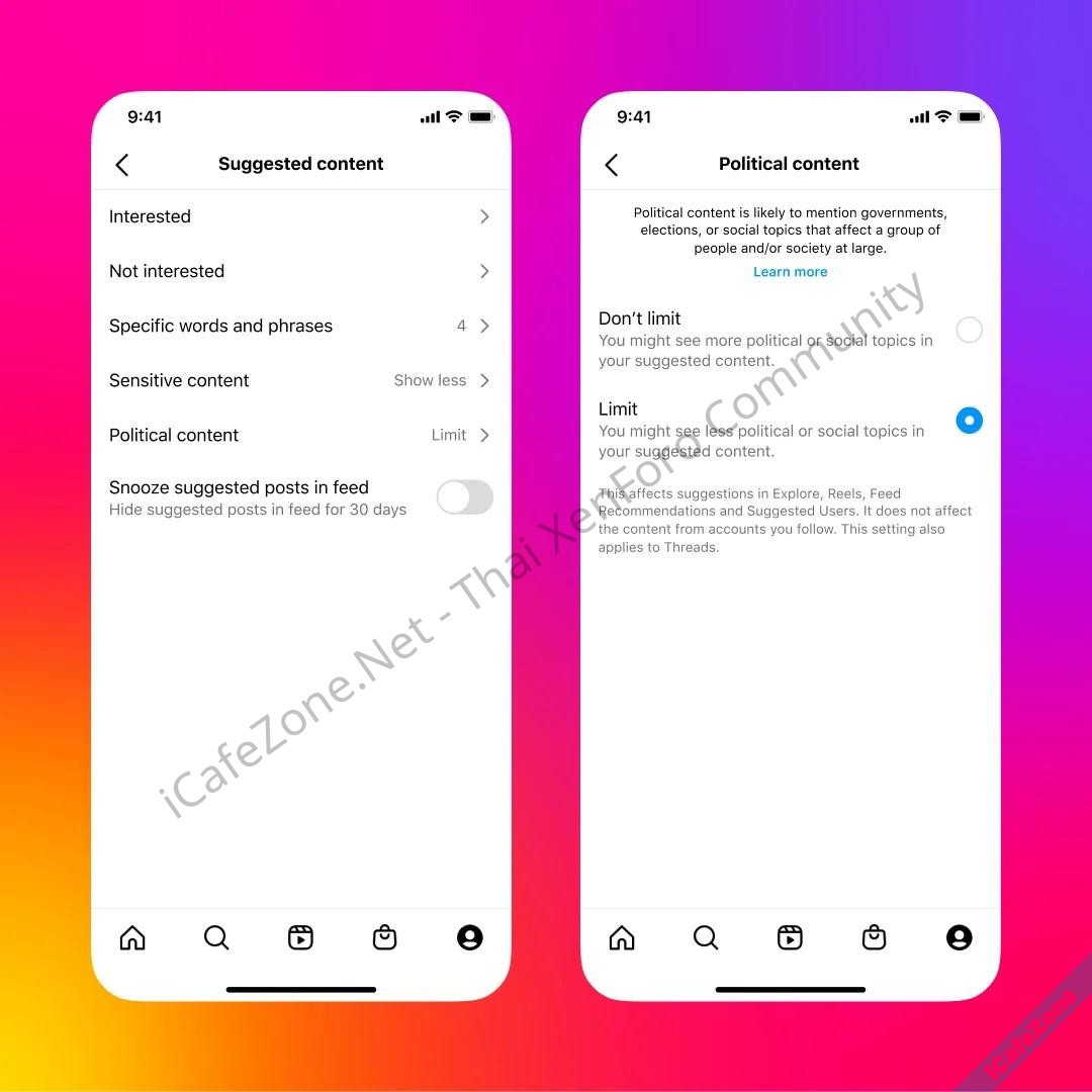 Instagram และ Threads ประกาศแนวทางจัดการเนื้อหาที่เกี่ยวกับการเมือง โดยจะไม่มีการแนะนำ-แสดงโพสต์คนที่ไม่ติดตาม หากเป็นเนื้อหาเกี่ยวกับการเมือง มีผลในทุกส่วนรวมทั้งหน้าฟีด, Explore, Reels