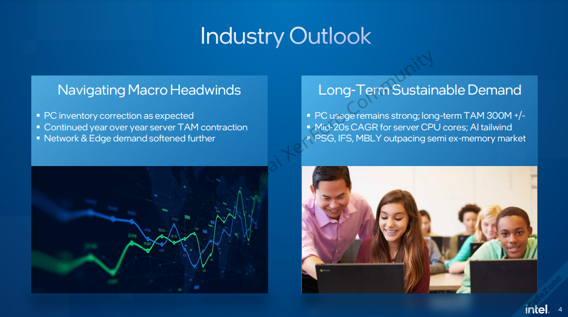 David Zinsner ซีเอฟโออินเทลกล่าวว่าภาพรวมตลาดจะกลับสู่ภาวะปกติภายในปีนี้ เมื่อผู้ผลิตพีซีเริ่มเคลียร์สินค้าคงคลังโดยเฉพาะชิป แล้วเริ่มเปิดคำสั่งซื้อใหม่เข้ามา ขณะที่ซีอีโอ Pat Gelsinger บอกว่าในไตรมาสปัจจุบันเขาเริ่มเห็นสถานการณ์ที่ดีขึ้นในตลาดพีซี อินเทลยังคงเดินหน้าตามแผนงานระยะยาวหลายปีในการเป็นผู้นำตลาดชิปประมวลผล