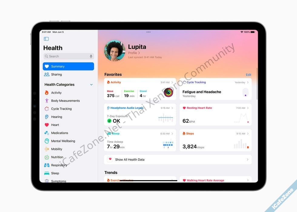 อีกหนึ่งของใหม่ใน iPadOS 17 คือการนำแอป Health มาใส่เป็นครั้งแรก ทำให้สามารถดูข้อมูลได้ละเอียดบนหน้าจอเดียว พร้อมกับรายละเอียดอื่นเช่นเดียวกับแอปใน iPhone