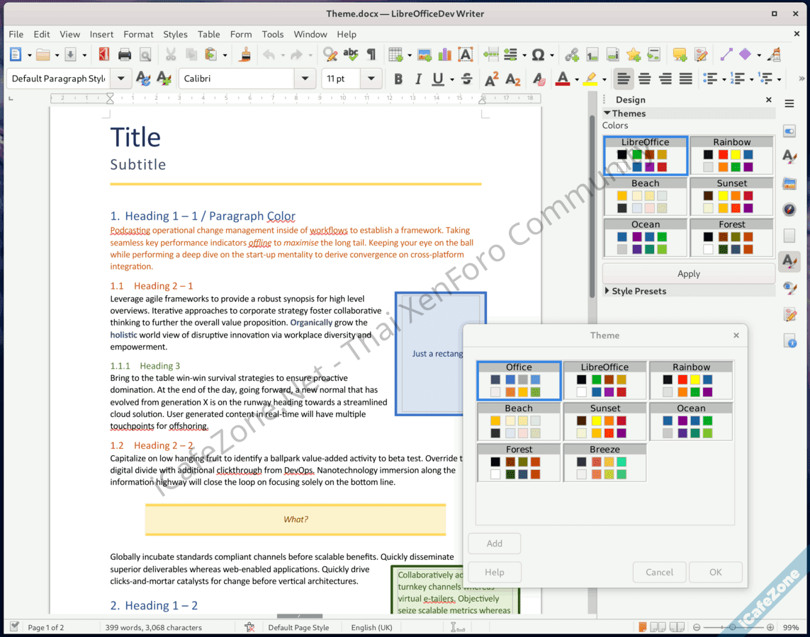 - รองรับธีมสีของเอกสาร สามารถ import/export ธีมได้สำหรับเอกสาร ODF, OOXML