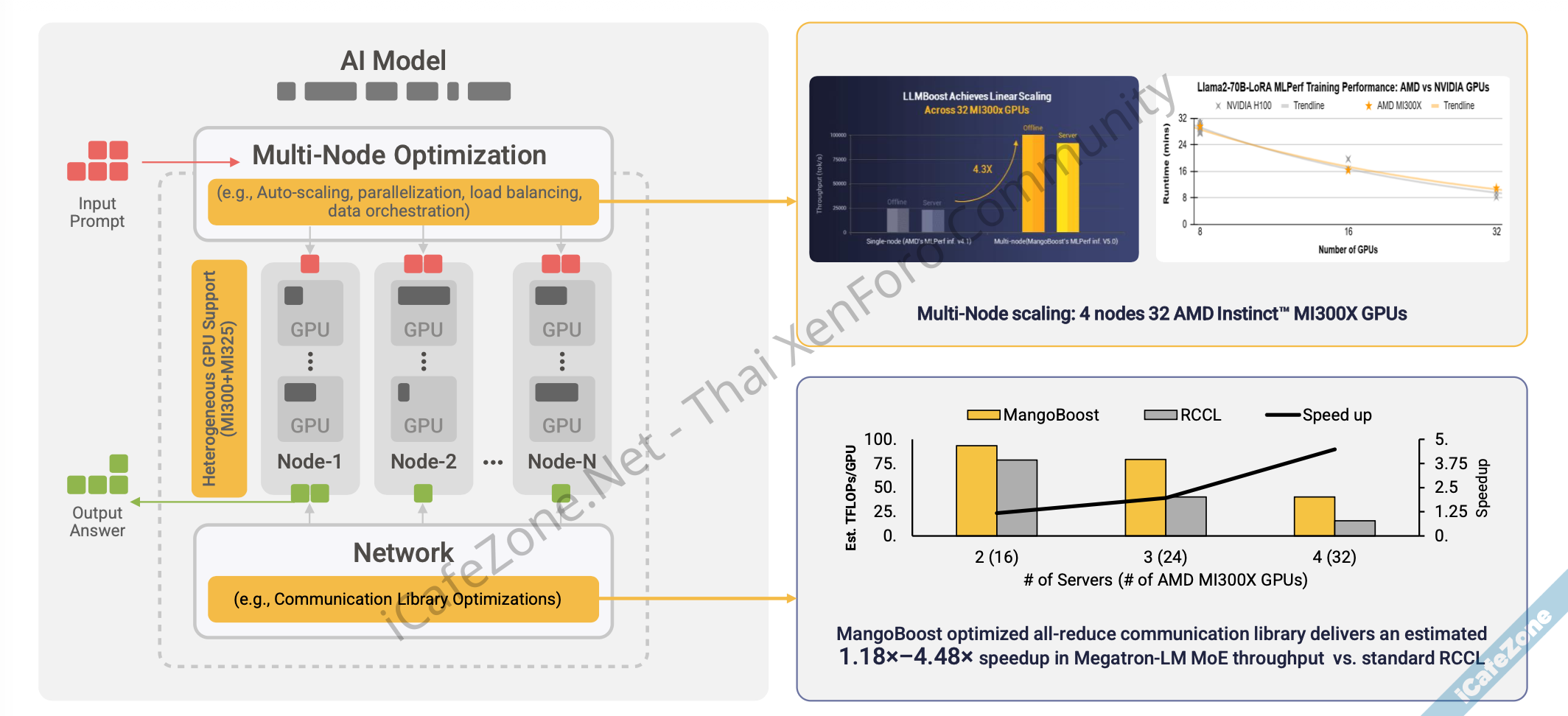 AMD เองมีซอฟต์แวร์สื่อสารข้ามเครื่องของตัวเองในชื่อ RCCL (อ่านว่า rickle) แต่ทาง MangoBoost ระบุว่าซอฟต์แวร์ของบริษัทเร่งความเร็วการฝึก LLM ได้เหนือ RCCL ถึง 4.3 เท่าตัวในบางกรณี เร่งให้คลัสเตอร์ของ AMD MI300X มีประสิทธิภาพพอๆ กับ NVIDIA H100 สำหรับการรันบนชิปรุ่นใหม่ๆ อย่าง AMD MI355X ก็ยังเร่งความเร็วได้ทั้งอัตราการสร้างโทเค็น และลดเวลาตอบโทเค็นแรก (time to first token) ในการทดสอบ MLPerf 6.0 เมื่อต้นเดือนที่ผ่านมา Dell ก็ร่วมกับ MangoBoost โชว์ผลทดสอบโดยอาศัยคลัสเตอร์ผสมชิป AMD 3 รุ่น คือ MI300X, MI325X, MI355X และยังได้ประสิทธิภาพการสร้างโทเค็นที่สูงมาก