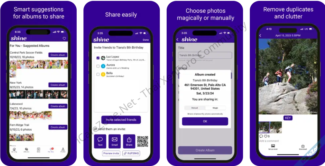 ฟีเจอร์ของ Shine เป็นการนำ AI มาช่วยจัดการรูปภาพ ตั้งแต่ AI คัดเลือกรูปภาพที่ดีที่สุดสำหรับแชร์ ในการอัปโหลดยังมีโหมด Magic ที่ AI จะสแกนรูปในโทรศัพท์และเลือกรูป พร้อมออกแบบชื่ออัลบั้มให้เสร็จสรรพ ไม่ต้องเหนื่อยเลือกรูปภาพเอง เมื่ออัปโหลดรูปแล้วก็สามารถแชร์ได้ทั้งแบบโค้ดกรอก, ลิงก์ หรือคิวอาร์