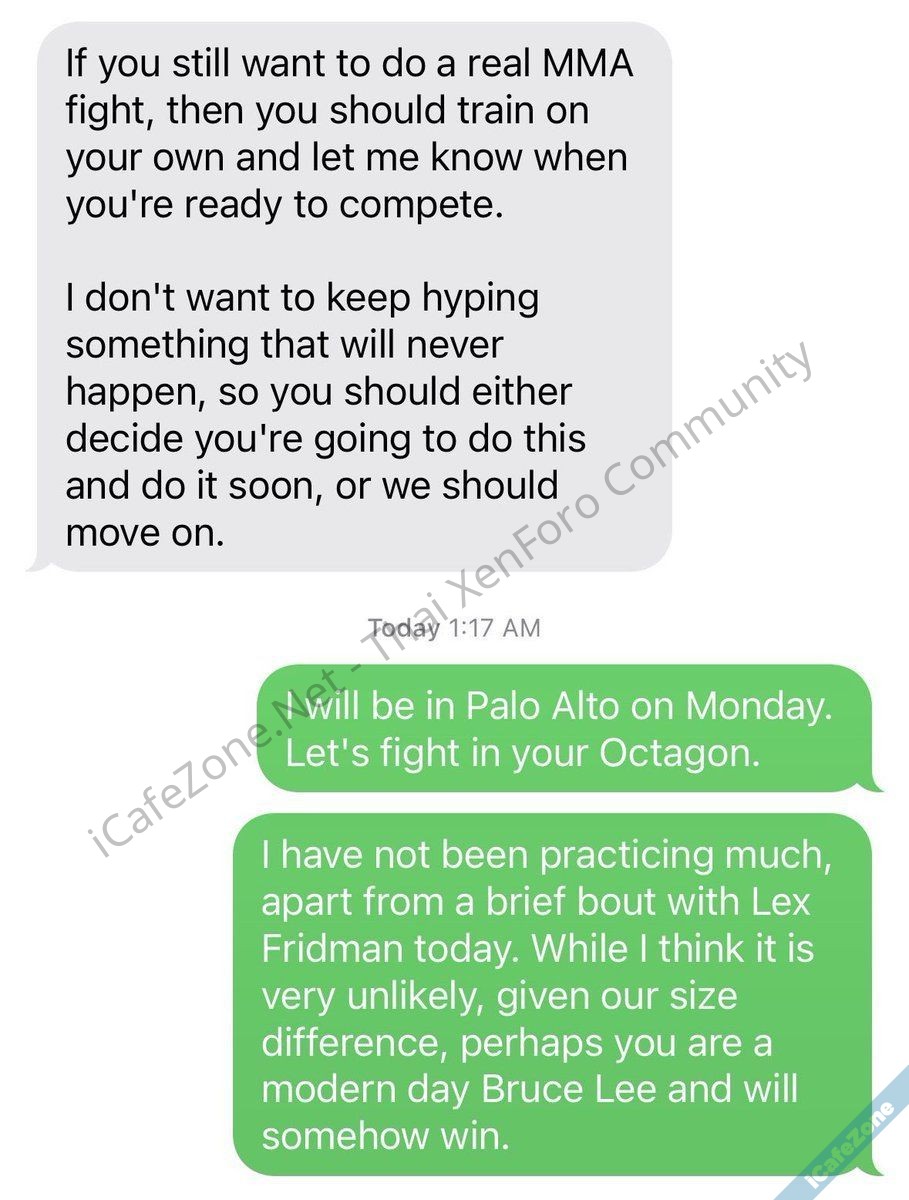 ในแชทนั้น Musk ทักไปหา Zuckerberg บอกว่าต้องการไปฝึกมวยที่บ้านเขาสัปดาห์หน้า (หลังบ้าน Zuckerberg มีกรงมวย 8 เหลี่ยม) Zuckerberg ตอบกลับว่าหากต้องการสู้แบบ MMA จริง ก็ควรไปฝึกฝนเองก่อน พร้อมเมื่อใดก็แจ้งมา เขาไม่อยากให้มีการสร้างกระแสที่ไม่เกิดขึ้นจริงสักที อยากให้ Musk บอกชัดเจนว่าจะทำอะไร ตอนไหน หรือจะยกเลิกไปเลย