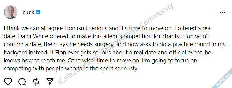 Mark Zuckerberg ตอบประเด็นนี้ผ่าน Threads ว่าพวกเราสามารถเห็นตรงกันว่า Elon ไม่ได้จริงจังเรื่องนี้ และเราควรเลิกสนใจได้แล้ว เขาได้เสนอทั้งวันจัดแข่งทางการ ได้ Dana White ประธาน UFC มาเสนอรูปแบบการจัดที่เป็นกติกาสากล และหาเงินเข้าการกุศล แต่ Elon ก็ไม่ยืนยันวันแข่ง บอกว่าต้องไปผ่าตัด ตอนนี้ก็มาขอซ้อมที่หลังบ้านเขา ซึ่งถ้า Elon จริงจังเรื่องนี้ เขาก็ควรรู้ว่าจะติดต่อตกลงกันอย่างไร เขาจึงคิดว่าจะเลิกสนใจเรื่องนี้แล้ว เพื่อไปโฟกัสการแข่งศิลปะการต่อสู้ในแบบกีฬาที่เป็นทางการดีกว่า (ปัจจุบันเขาได้สายน้ำเงินกีฬายิวยิตสู)