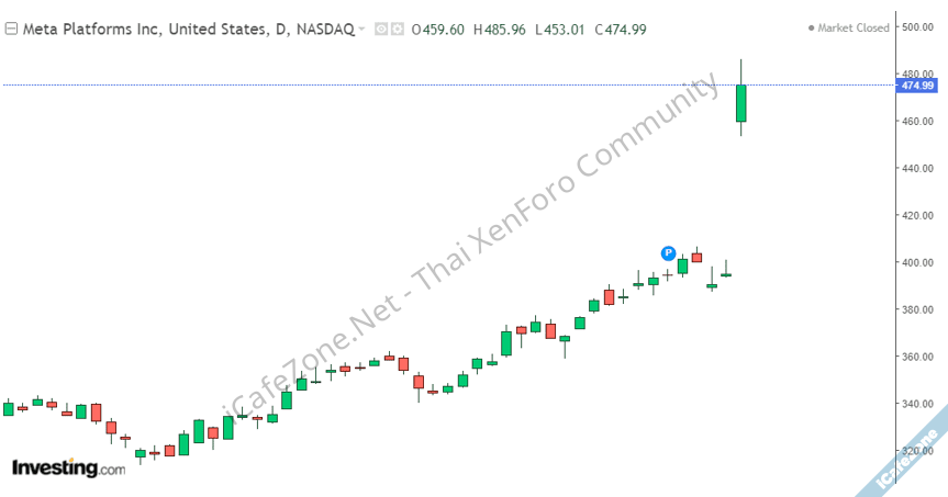ราคาหุ้นของ Meta Platforms บริษัทแม่ของ Facebook, Instagram ปรับเพิ่มขึ้นเมื่อคืนนี้ 20.32% ทำให้ราคาหุ้นปิดการซื้อขายที่ 474.99 ดอลลาร์ต่อหุ้น ทำสถิติราคาสูงสุดของบริษัท และมีมูลค่ากิจการตามราคาหุ้นหรือ Market Cap. เพิ่มขึ้น 1.97 แสนล้านดอลลาร์ เป็นสถิติใหม่สูงสุดภายในวันเดียว แซง Amazon เมื่อปี 2022 ซึ่งปีเดียวกัน Apple ก็ทำสถิติไปก่อนไม่กี่วัน