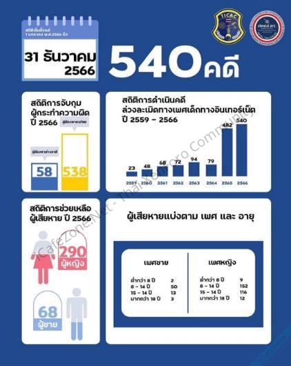 ส่วนประเทศไทยปี 2566 ที่ผ่านมา มีการจับกุมดำเนินคดีไปแล้วกว่า 540 คดี ปัจจัยมาจากการที่เด็กเข้าถึงออนไลน์มากขึ้น โดยอาชญากรรมมาในรูปแบบหลอกเด็กให้ถ่ายรูปแลกเงิน หรือเหยื่อโดนปล่อยรูปหลังจากจบความสัมพันธ์ เป็นต้น