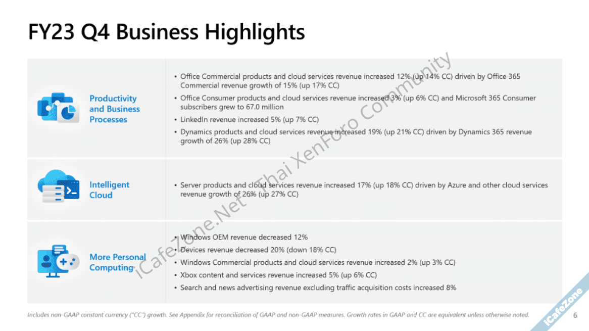 ไมโครซอฟท์รายงานผลประกอบการประจำไตรมาสที่ 4 ตามปีการเงินบริษัท 2023 สิ้นสุดเดือนมิถุนายน รายได้รวมตามบัญชี GAAP 56,189 ล้านดอลลาร์ เพิ่มขึ้น 8% จากช่วงเดียวกันในปีก่อน มีกำไรสุทธิ 20,081 ล้านดอลลาร์
