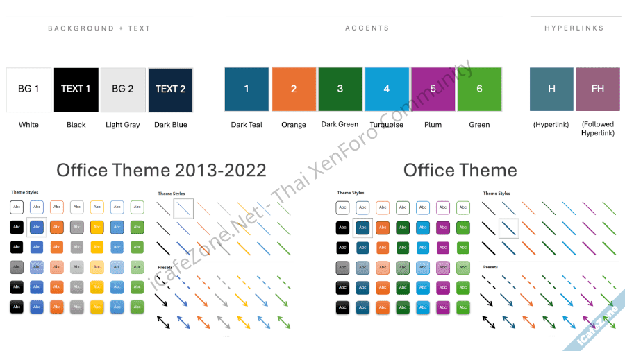 ธีมเดิมของ Office พร้อมฟอนต์ Calibri ยังคงอยู่ แค่เปลี่ยนชื่อเป็น Office Theme 2013–2022 แทน สไตล์เอกสารเดิมก็เปลี่ยนชื่อเป็น Word 2013 ด้วยเช่นกัน