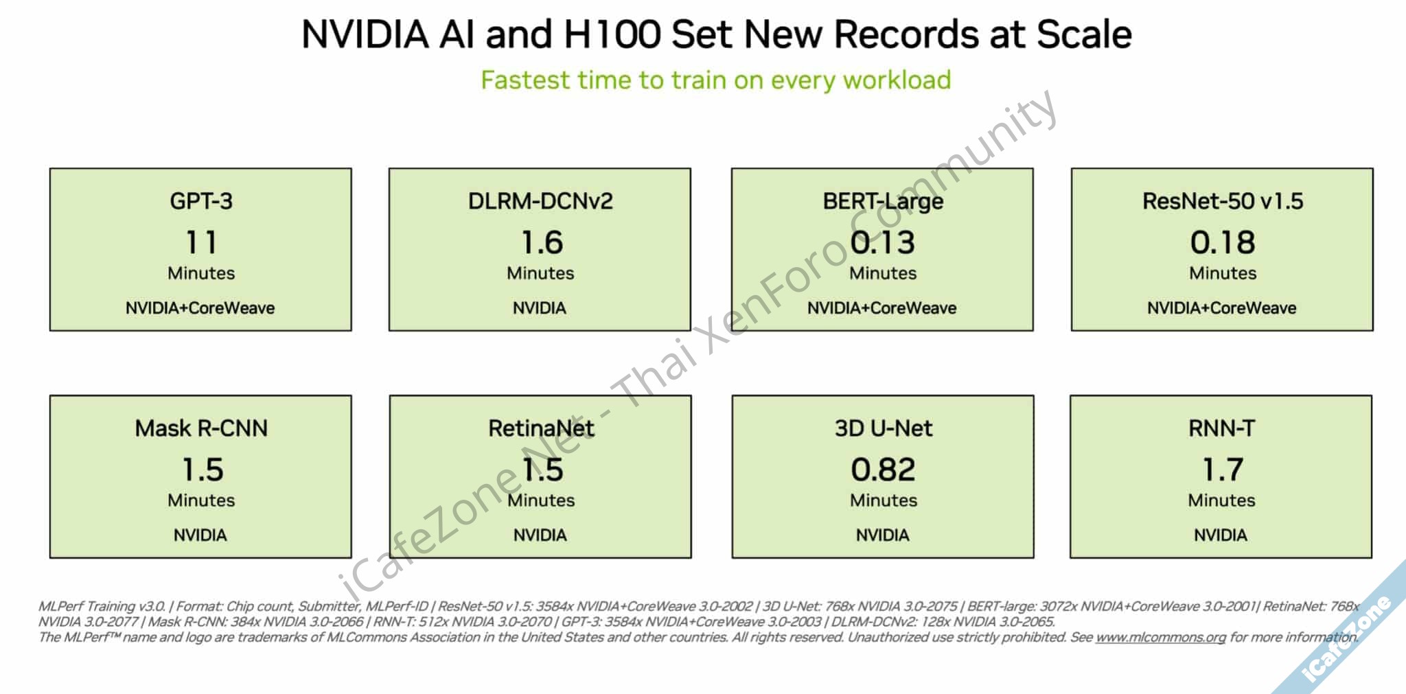 ผลทดสอบอันดับหนึ่งในหมวด LLM เป็นของ NVIDIA และ CoreWeave ที่ทดสอบด้วยระบบที่ใช้ Xeon Platinum 8462Y+ จำนวน 896 ตัว ร่วมกับ NVIDIA H100-SXM5-80GB อีก 3,584 ใบ ใช้ซอฟต์แวร์ NVIDIA NeMo Megatron Release 23.04 สามารถทำเวลาการฝึก GPT-3 ได้ในเวลา 10.9 นาทีเท่านั้น ทาง NVIDIA ระบุว่าผลทดสอบนี้จะสร้างมาตรฐาน และชิป NVIDIA ก็สามารถส่งผลทดสอบทุกชุดทดสอบได้หมด