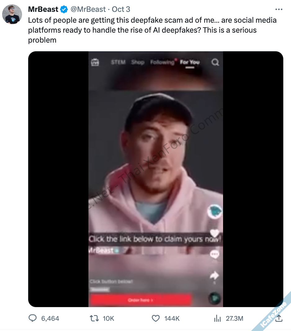 MrBeast ยูทูปเบอร์ที่มีผู้ติดตามมาก 188M subscribers ทวีตบน X พบว่ามีโฆษณาที่สร้างจาก AI Deepfake ด้วยหน้าของเขาปรากฏขึ้นบน TikTok บอกว่าจะให้ iPhone 15 Pro จำนวน 10,000 เครื่อง เพียงจ่ายเงินให้เขา 2 ดอลลาร์สหรัฐ