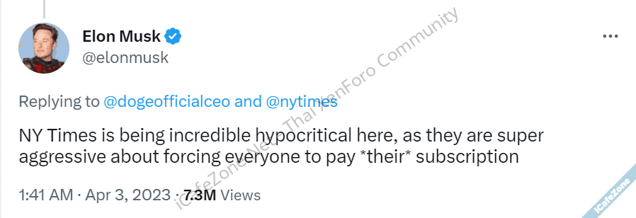 หลังจากนั้น Elon Musk ได้ทวีตโจมตี New York Times ว่า “ปากว่าตาขยิบ” (hypocritical) เพราะสำนักข่าวก็พยายามบีบให้คนไปสมัคร subscription ของตัวเอง รวมถึงโจมตีด้วยว่า propaganda ของ NYT ไม่ได้น่าสนใจ ฟีดเหมือนอุจจาระ (FYI สำนักข่าว NYT นับเป็นสื่อที่เอนไปทางก้าวหน้า เทียบกับอุดมการณ์ของ Musk ที่อนุรักษนิยม)
