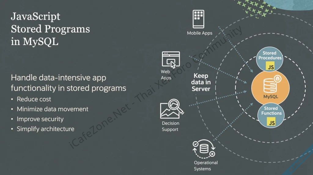เมื่อเดือนธันวาคมที่ผ่านมา MySQL ประกาศเพิ่มฟีเจอร์การรันโค้ดภาษา JavaScript จากในฐานข้อมูลโดยตรง (stored programs) ลักษณะเดียวกับที่ Oracle Database ทำได้มาก่อนหน้านี้ (เวอร์ชัน 21c เป็นต้นมา)