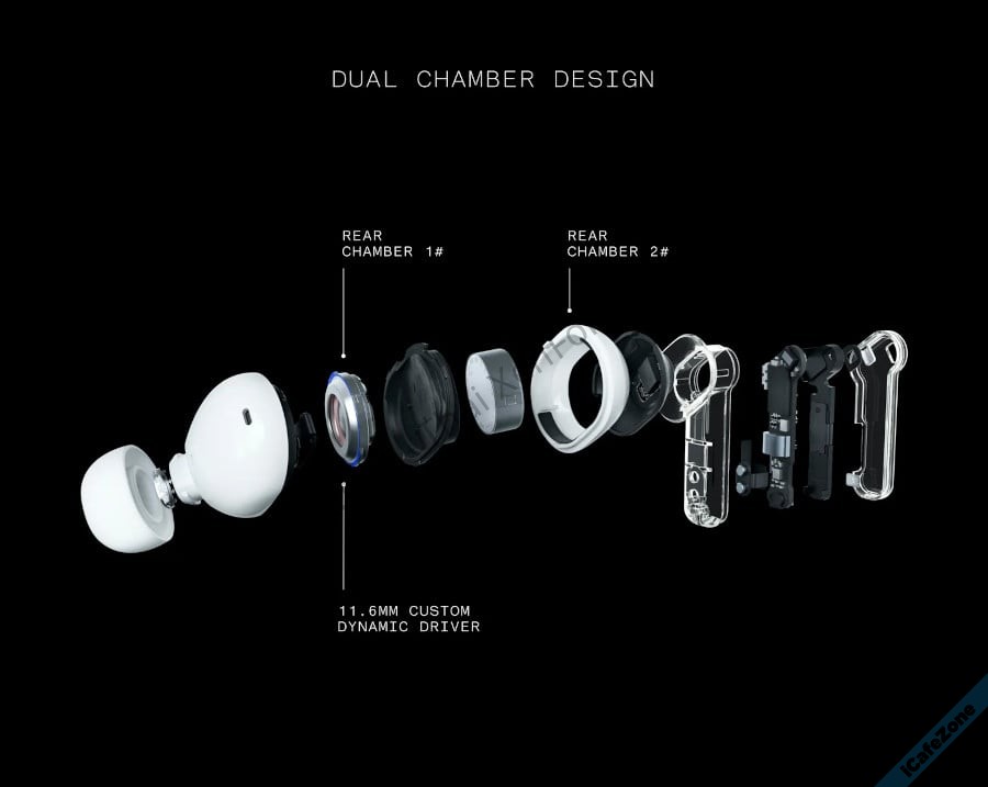 ของใหม่ที่สำคัญของ Ear (2) อยู่ที่ระบบเสียง ตัวไดรเวอร์ยังมีขนาด 11.6 มม. เท่าเดิม แต่ออกแบบใหม่เป็น Dual Chamber, รองรับระบบเสียง Hi-Res codec LHDC 5.0 และฟีเจอร์สำคัญคือตัดเสียงรบกวน (ANC) แบบปรับแต่งได้เฉพาะบุคคล สลับโปรไฟล์ได้ 3 แบบ