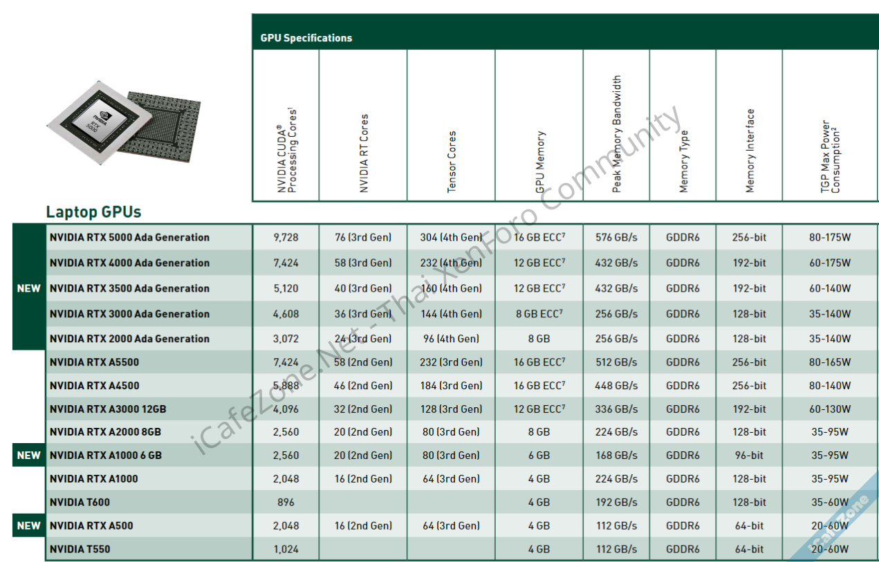 - โน้ตบุ๊ก มี 5 รุ่นย่อยคือ RTX 5000, RTX 4000, RTX 3500, RTX 3000, RTX 2000