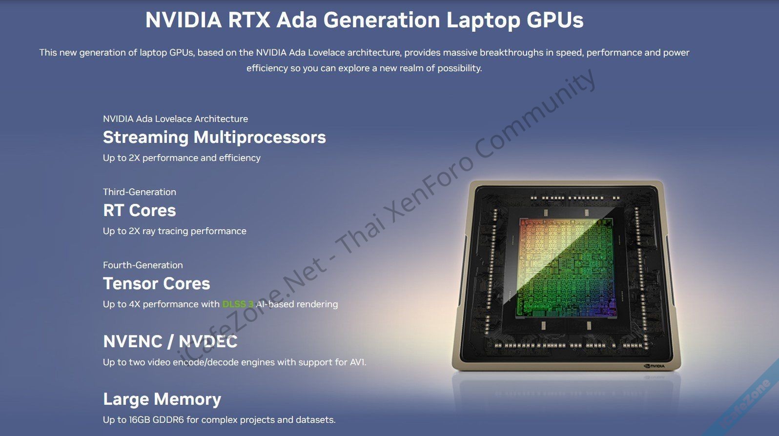 สเปกอย่างละเอียดของ RTX Ada Generation ดูได้จากตารางเปรียบเทียบ โดยรุ่นท็อปสุด RTX 5000 มี CUDA Core 9,782 คอร์, RT Core 76 คอร์, Tensor Core 304 คอร์, แรม 16GB GDDR6 EEC 256-bit, TDP 8--175W