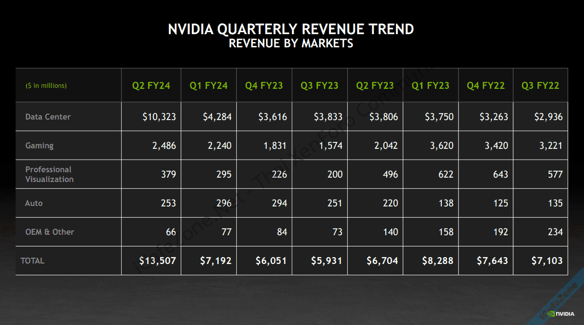 NVIDIA รายงานผลประกอบการประจำไตรมาสที่ 2 ของปีการเงินบริษัท 2024 สิ้นสุดเดือนกรกฎาคม รายได้ในไตรมาสทำสถิติสูงสุดของบริษัทที่ 13,507 ล้านดอลลาร์ เพิ่มขึ้น 101% เมื่อเทียบกับไตรมาสเดียวกันในปีก่อน และเพิ่มขึ้น 88% เมื่อเทียบกับไตรมาสก่อนหน้านี้ กำไรสุทธิตามบัญชี GAAP เพิ่มขึ้นเป็น 6,188 ล้านดอลลาร์