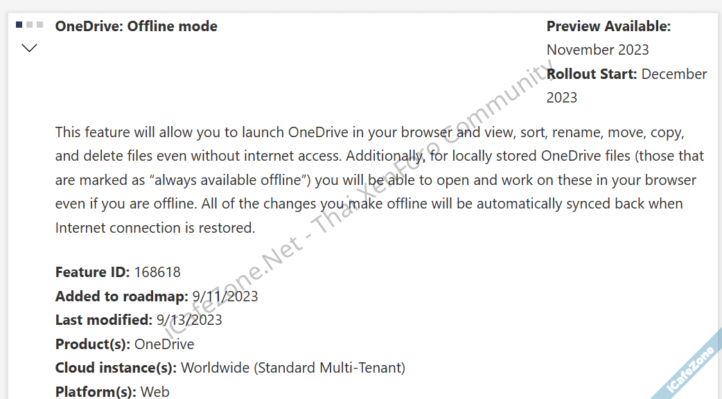 ไมโครซอฟท์ประกาศข้อมูลในเว็บ Microsoft 365 roadmap ว่า OneDrive เวอร์ชันเว็บจะสามารถทำงานแบบออฟไลน์ได้ในเร็วๆ นี้ ผู้ใช้สามารถจัดการไฟล์ ลบไฟล์ เปลี่ยนชื่อ ย้ายไฟล์ได้ผ่านเบราว์เซอร์โดยไม่ต้องมีอินเทอร์เน็ต และการเปลี่ยนแปลงจะซิงก์กลับเมื่อต่อเน็ตในภายหลัง