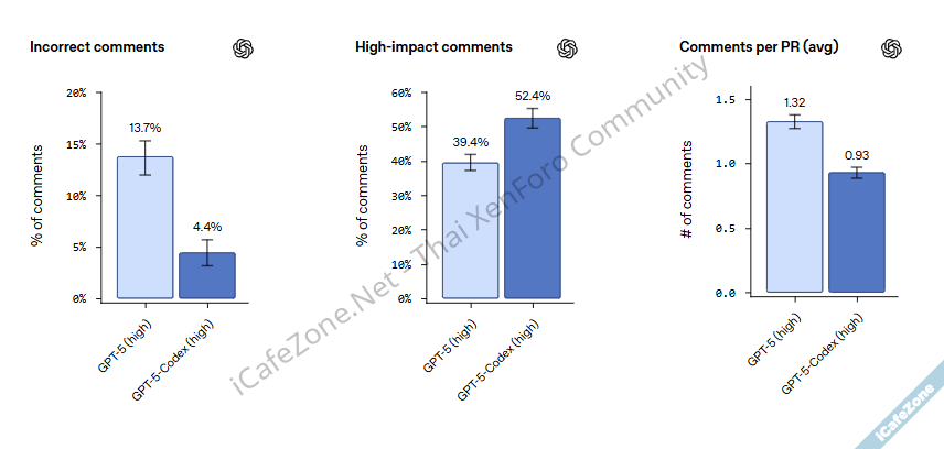 GPT-5-Codex โมเดลสำหรับเครื่องมือ AI ช่วยเขียนโค้ด Codex ตัวใหม่ที่พัฒนามาจาก GPT-5 เพื่องานเขียนโค้ดโดยเฉพาะ มีจุดเด่นในการปรับระยะเวลาคิดได้เองว่าควรมากหรือน้อย จึงตอบสนองได้ในระดับไม่กี่วินาที ไปจนถึงการคิดที่นานมากขึ้นกว่า 7 ชั่วโมง หากประเมินว่าเป็นโจทย์ที่ซับซ้อนสูงGPT-5-Codex ได้รับการฝึกฝนเน้นกิจกรรมเกี่ยวกับการเขียนโค้ด จึงมีความสามารถมากขึ้นในการรีวิวโค้ด พบว่าให้คอมเมนต์ในจุดที่สำคัญได้แม่นยำมากขึ้น โดยเฉพาะกับปัญหาที่มีผลกระทบสูง คะแนนทดสอบของ SWE-bench Verified ทำคะแนนได้สูงกว่า GPT-5