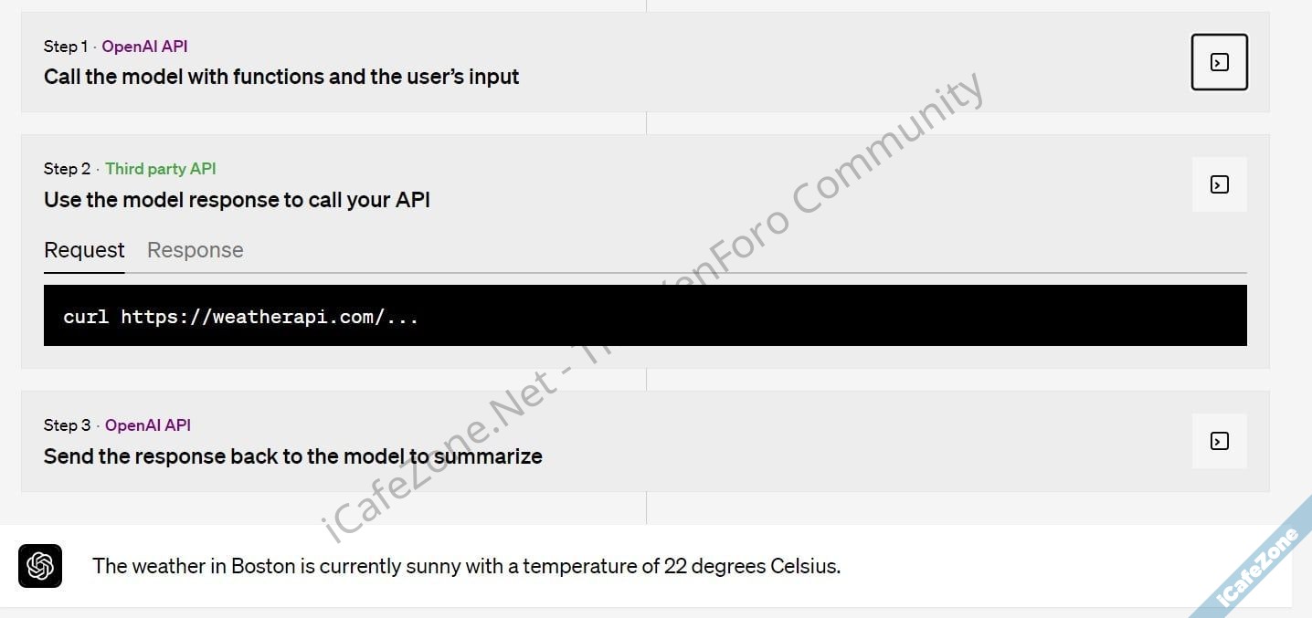 นักพัฒนาต้องกำหนดข้อมูลฟังก์ชั่นที่ต้องการเรียกส่งไปพร้อมกับคำถามของผู้ใช้ เช่น กำหนดฟังก์ชั่นคิวรีสภาพอากาศปัจจุบัน เมื่อผู้ใช้ถามถึงสภาพอากาศ ค่าตอบกลับจาก Chat Completion API จะระบุว่า AI ต้องการเรียกฟังก์ชั่น แล้วนำอาร์กิวเมนต์ต่างๆ มารันฟังก์ชั่นแล้วส่งข้อมูลกลับไปให้ AI ตอบคำถามอีกทีหนึ่ง