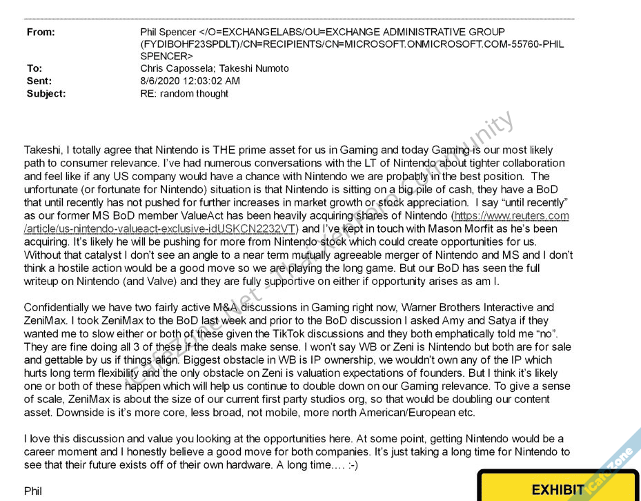 อีกหนึ่งเอกสารที่หลุดออกมาจาก FTC คืออีเมลภายในของ Phil Spencer ส่งถึง Takeshi Numoto และ Chris Capossela ผู้บริหารฝั่งการตลาดของไมโครซอฟท์ พูดถึง Nintendo ว่าจะเป็นทรัพย์สินอันทรงคุณค่าในโลกของเกมสำหรับบริษัท ("PRIME Asset") โดยเจ้าตัวเคยพูดคุยกับทีมบริหารของ Nintendo เรื่องความร่วมมือด้วย แต่อีกฝ่ายรวยเกินจะสนใจ