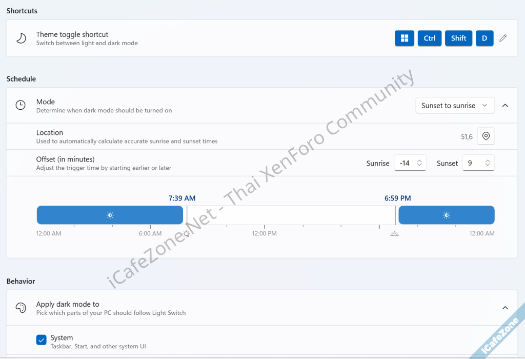 ผู้ใช้จะสามารถกำหนดเวลาที่อยากให้สลับโหมดได้เอง หรือให้ Light Switch ช่วยกำหนดตามเวลาพระอาทิตย์ขึ้น/พระอาทิตย์ตก หรือจะกำหนดคีย์ลัดเพื่อใช้กดสลับโหมดเองอย่างรวดเร็วก็ทำได้เช่นกัน