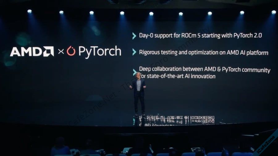 Soumith Chintala ผู้ก่อตั้ง PyTorch และตัวแทน PyTorch Foundation ขึ้นเวทีงาน AMD ประกาศว่าซอฟต์แวร์ PyTorch 2.0 จะทำงานได้บนแพลตฟอร์มของ AMD ตั้งแต่แรก (Day 0 support) ไม่ต้องรออัพเดตตามหลังเหมือนกับสมัยก่อนๆ ที่ซอฟต์แวร์ด้าน AI มักอิงอยู่บนแพลตฟอร์ม NVIDIA CUDA อย่างเดียว