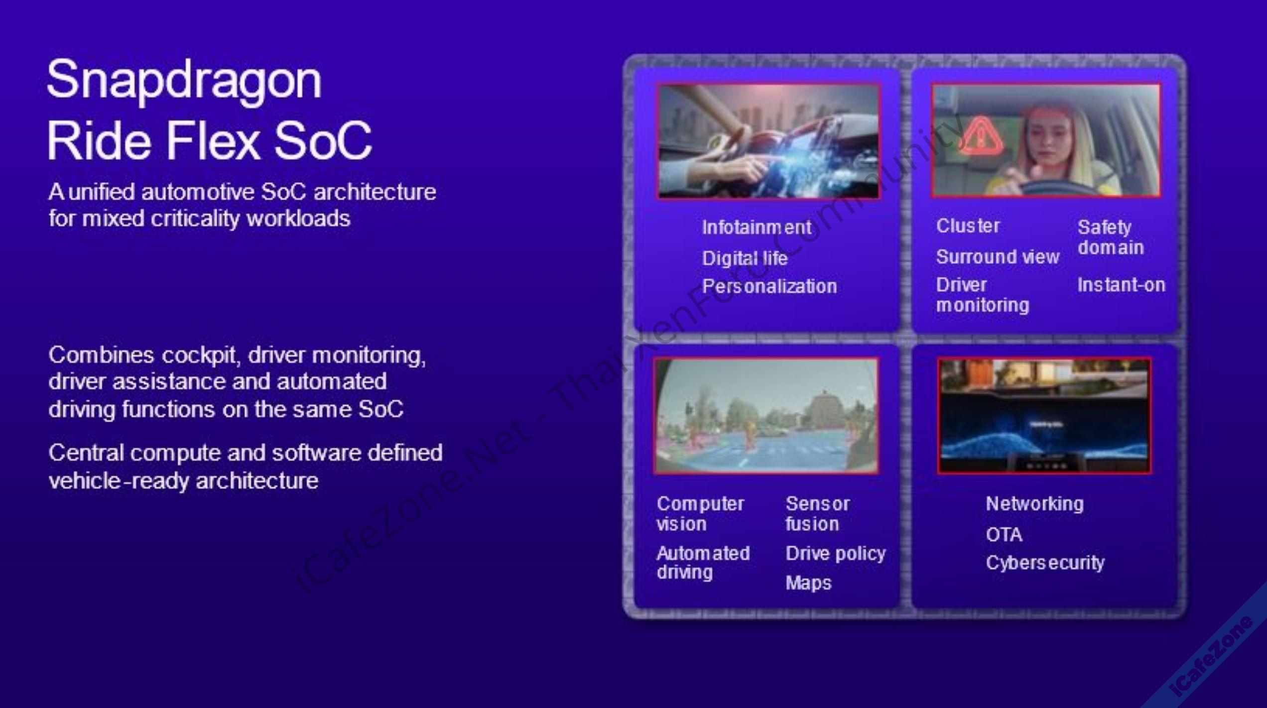 ล่าสุดในงาน CES 2024 ทาง Qualcomm เปิดตัวชิปรุ่นใหม่ Snapdragon Ride Flex SoC มีจุดเด่นคือการรวมงานประมวลผลภายในรถยนต์เข้าด้วยกันบน SoC ตัวเดียว ได้แก่ Computer Vision (CV) สำหรับระบบช่วยขับขี่ (advanced driver assistance system หรือ ADAS) และระบบขับเคลื่อนอัตโนมัติ (automated driving หรือ AD รองรับถึง L3) และระบบแสดงผลบนหน้าจอในรถยนต์ (Cockpit/IVI)