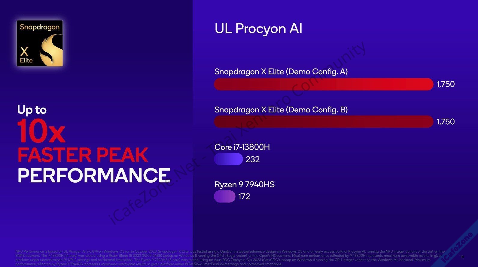 เบนช์มาร์คด้าน AI ใช้ UL Procyon AI คุยว่าแรงกว่าซีพียูกลุ่ม x86 ถึง 10 เท่า ทั้งนี้ต้องโน้ตว่าซีพียูของ Intel/AMD รุ่นที่นำมาเทียบไม่มีชิป NPU ในตัวเหมือนกับ Qualcomm