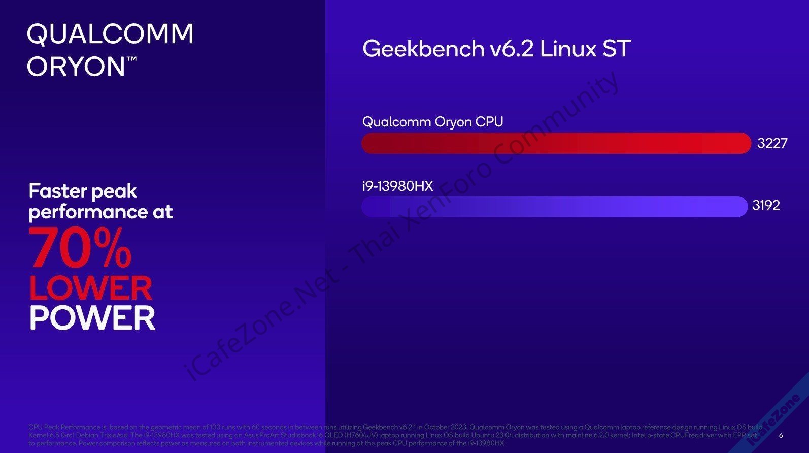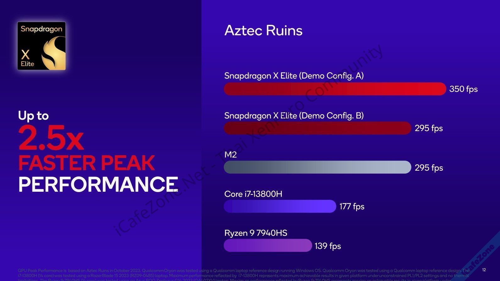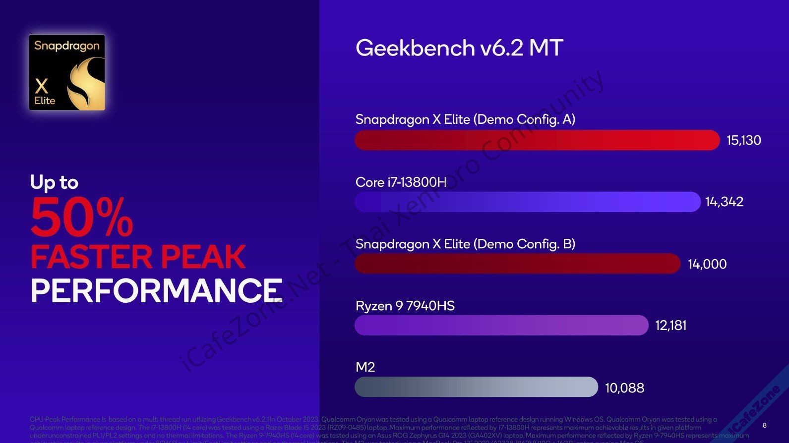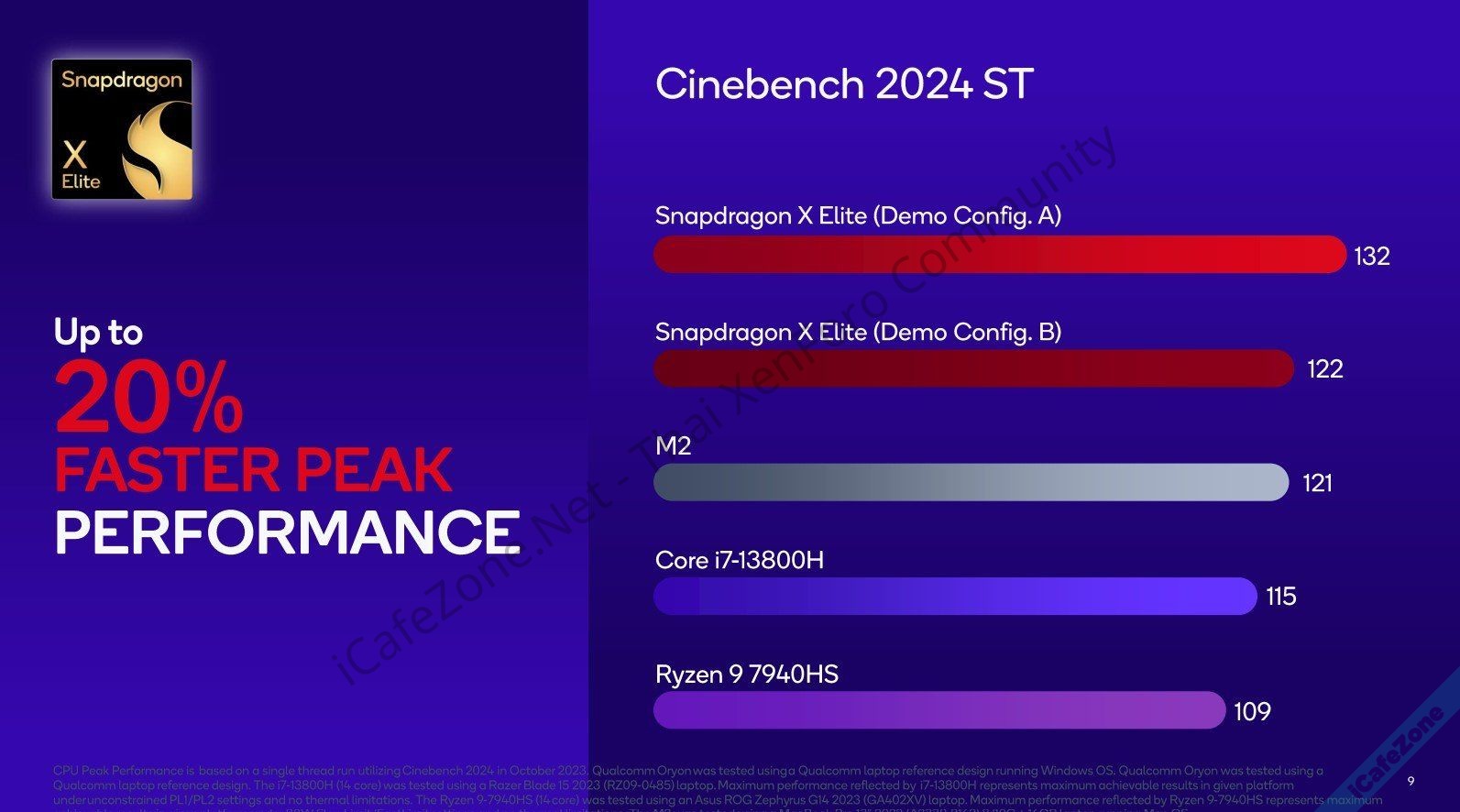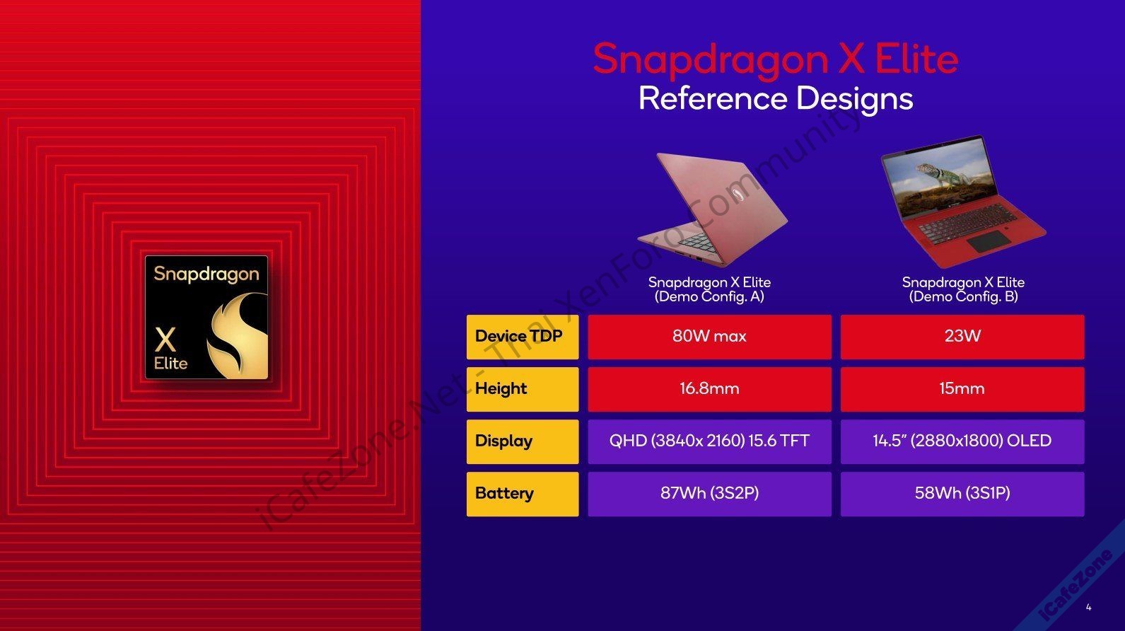 การทดสอบของ Qualcomm อยู่บนโน้ตบุ๊กรุ่นต้นแบบ 2 เครื่องที่ใช้ชิป X Elite ตัวเดียวกัน โดยเครื่อง A มีค่า TDP 80W และเครื่อง B อยู่ที่ 23W เพื่อแสดงให้เห็นโปรไฟล์ของการใช้พลังงานที่ต่างกัน