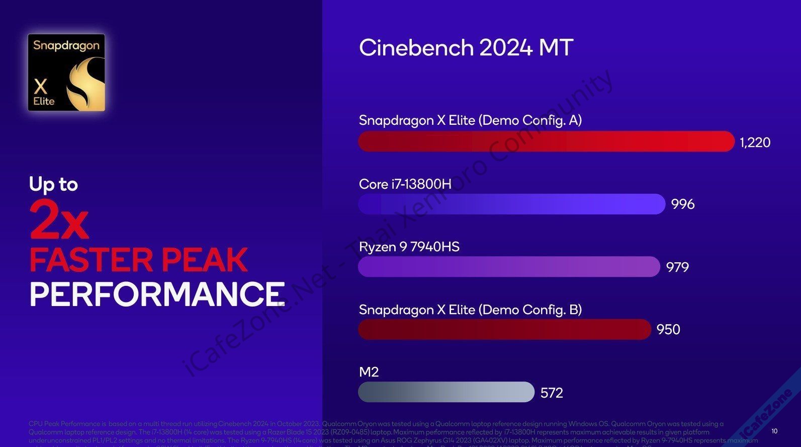 Qualcomm โชว์ผลการรันเบนช์มาร์คของชิป Snapdragon X Elite ที่เพิ่งเปิดตัว และคุยว่ามีสมรรถนะเหนือซีพียูรุ่นอื่นๆ ในตลาดทั้ง x86 และ Apple M2 (ผลเบนช์มาร์คออกมาก่อน M3 ที่เพิ่งเปิดตัวเมื่อเช้านี้)