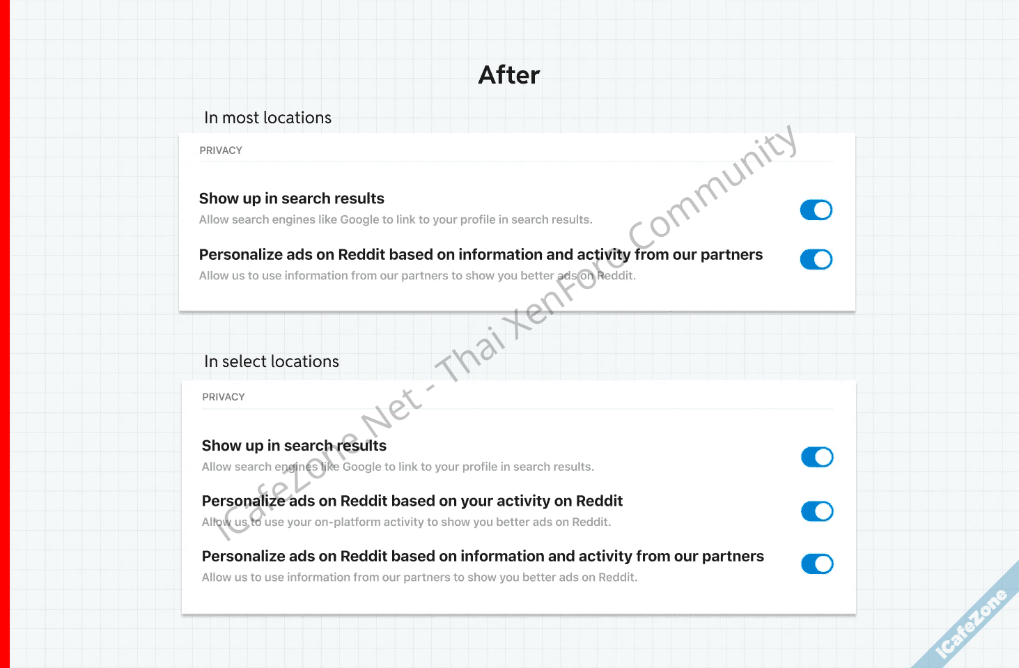 ทั้งนี้ การปรับตัวเลือกห้าม opt-out ครั้งนี้ ยังมียกเว้นอยู่แค่บางภูมิภาคที่ยังสามารถเลือกได้ ซึ่ง Reddit ไม่ได้ระบุว่าเป็นภูมิภาคใด แต่ก็คาดว่าน่าจะเป็นยุโรป ที่มีกฎหมาย GDPR ที่ต้องให้ผู้ใช้งานอนุญาตอย่างชัดเจน ในการเก็บและใช้ข้อมูลโปรไฟล์เพื่อการโฆษณา