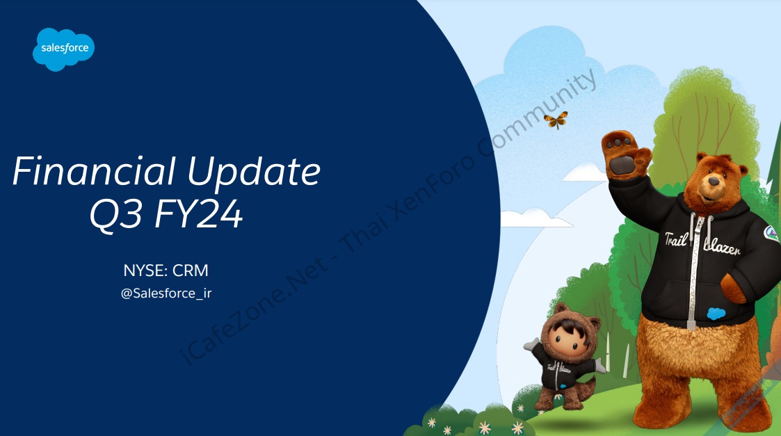 Salesforce รายงานผลประกอบการประจำไตรมาสที่ 3 ตามปีการเงินบริษัท 2024 สิ้นสุดเดือนตุลาคม มีรายได้รวม 8,720 ล้านดอลลาร์ เพิ่มขึ้น 11% เทียบกับไตรมาสเดียวกันในปีก่อน และมีกำไรสุทธิตามบัญชี GAAP ที่ 1,224 ล้านดอลลาร์