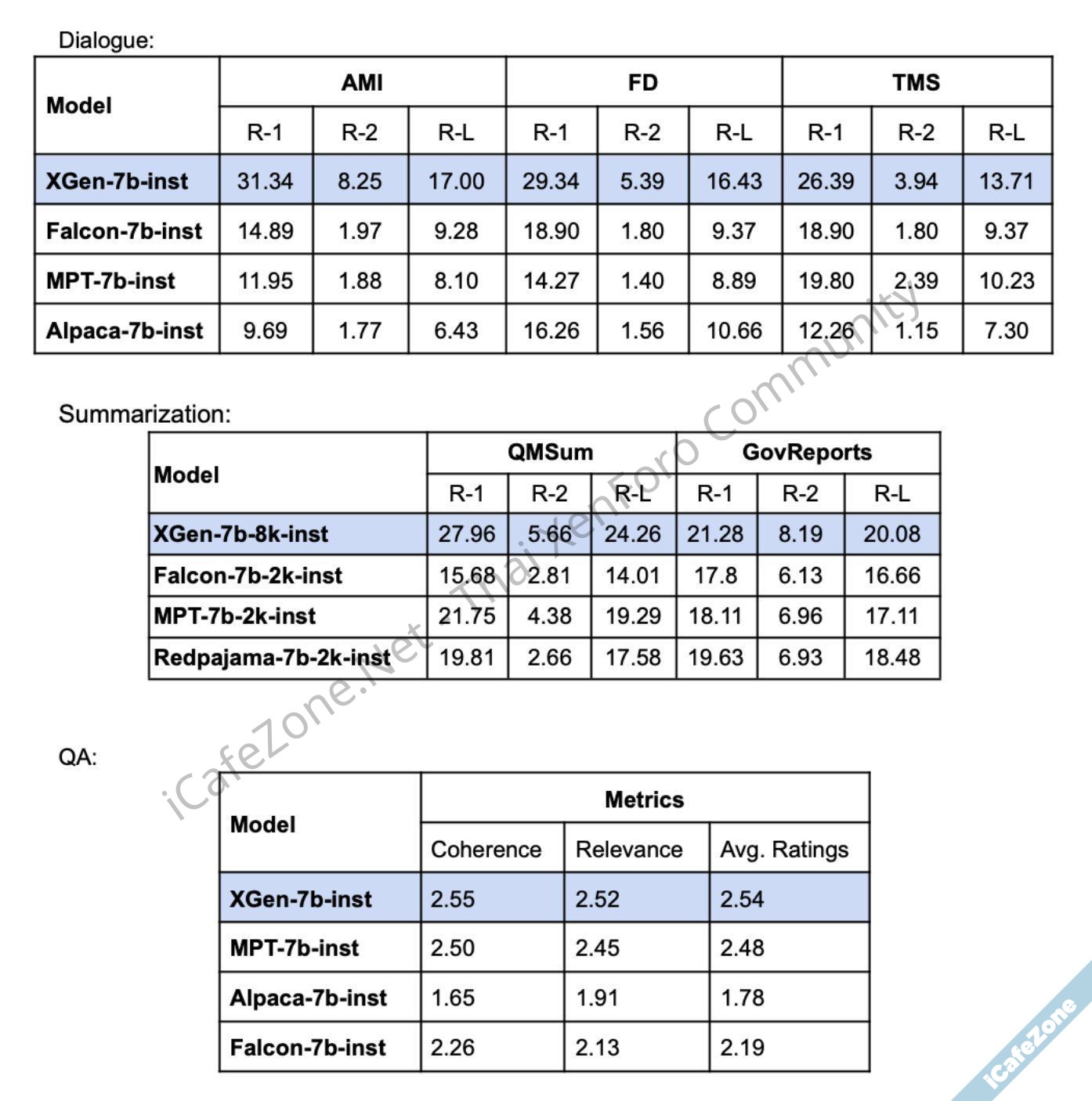 คะแนนทดสอบหมวดต่างๆ ของ XGen-7B นั้นใกล้เคียงกับ Falcon-7B, MPT-7B แต่เมื่อทดสอบกับชุดทดสอบที่มีความยาว เช่น ชุดทดสอบการสรุปข้อมูลความยาวมากๆ คะแนนทดสอบก็สูงกว่าโมเดลคู่แข่งอย่างชัดเจน