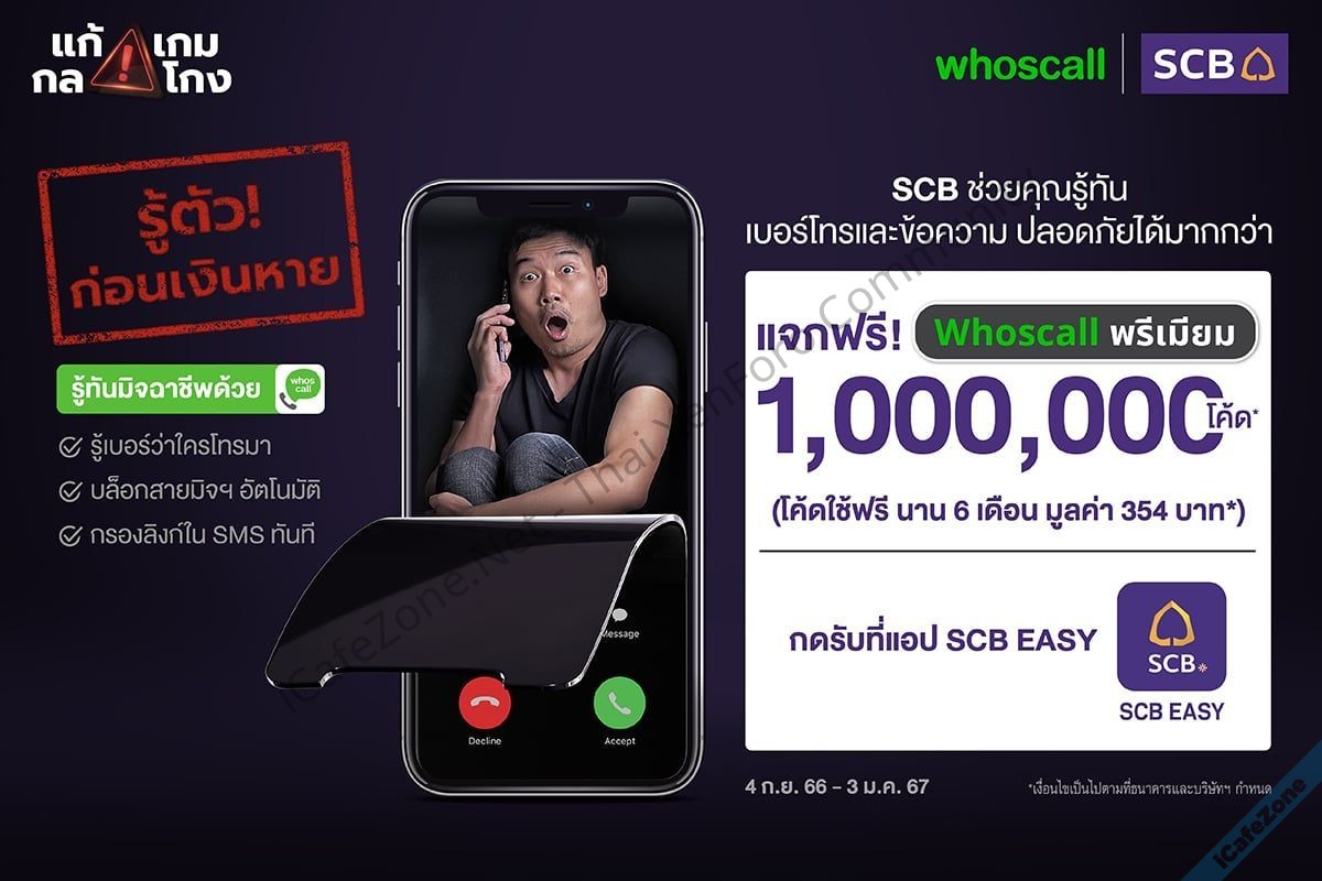 ธนาคารไทยพาณิชย์จัดทำโครงการ แก้เกมกลโกง "รู้ตัว! ก่อนเงินหาย" ร่วมกับแอป “Whoscall” ที่จะช่วยระบุหมายเลขโทรศัพท์ที่ไม่รู้จักและบล็อกสแปม ด้วยการแจกโค้ด Whoscall พรีเมียมฟรี 1 ล้านโค้ด นาน 6 เดือน มูลค่ารวมกว่า 354 ล้านบาท สำหรับลูกค้า SCB EASY เพียงกดรับโค้ด Whoscall พรีเมียม ผ่านเมนู EASY BONUS บนแอปพลิเคชัน SCB EASY ได้ง่ายๆ ตั้งแต่วันที่ 4 กันยายน 2566 – 3 มกราคม 2567 (จำกัด 1 คน/สิทธิ/ตลอดระยะเวลาแคมเปญ)