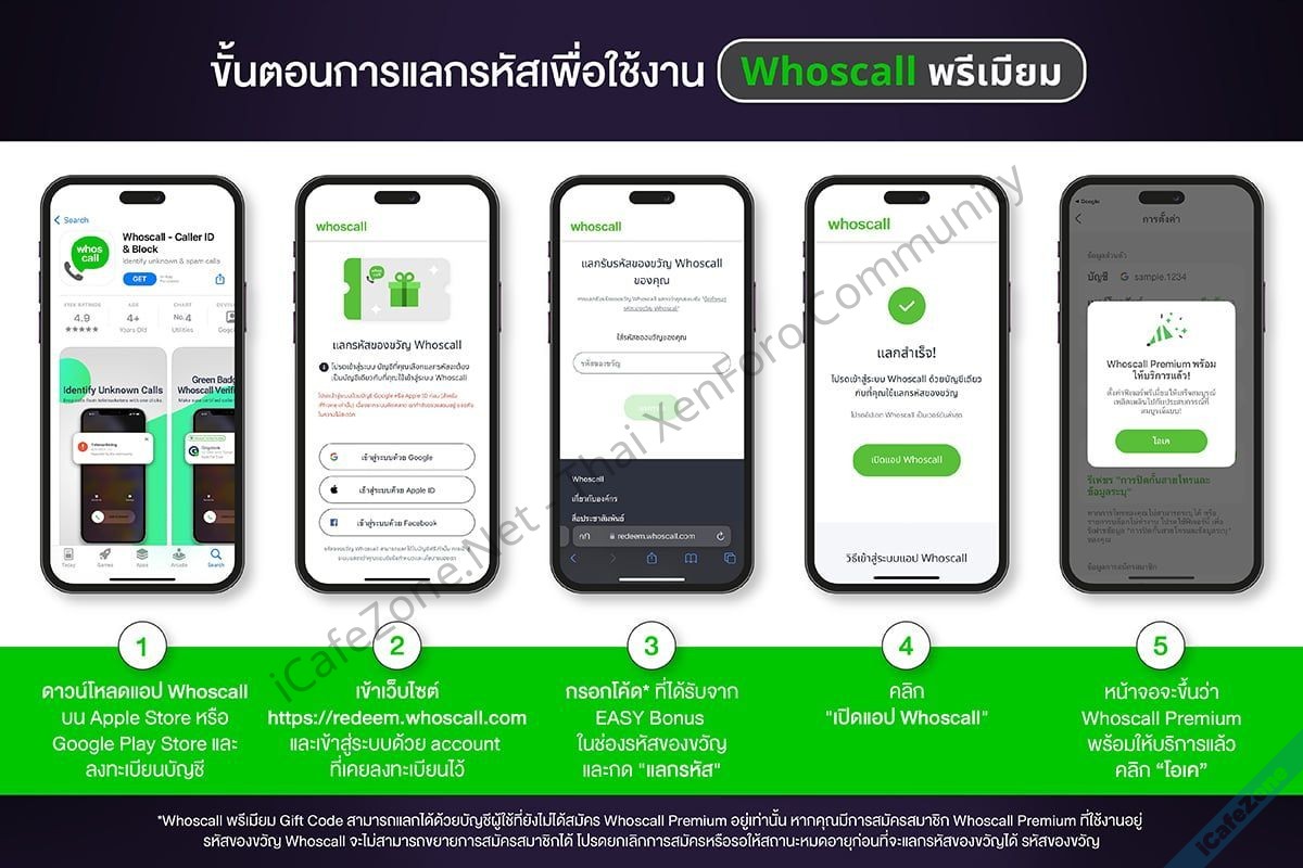 - นำโค้ด Whoscall พรีเมียมที่ได้รับ ไปแลกใช้ฟรีที่เว็บไซต์ redeem โดยใช้บัญชีผู้ใช้เดียวกับในแอปพลิเคชัน Whoscall ก็จะสามารถใช้ Whoscall พรีเมียมฟรีได้นาน 6 เดือน (โค้ดมีอายุ 7 วันหลังจากได้รับโค้ด ทั้งนี้โค้ดที่หมดอายุและไม่ได้นำมาใช้สิทธิถือว่าสละสิทธิ รวมทั้งไม่สามารถขอคืนสิทธิได้)