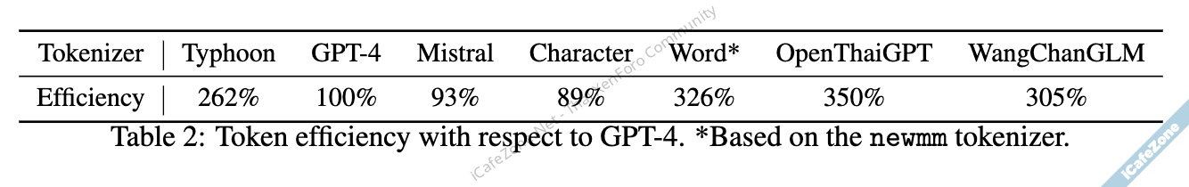 รายละเอียดเชิงลึก โมเดลพัฒนาต่อมาจาก Mistral-7B โดยใส่ภาษาไทยเข้าไป 5 พันคำ แล้วเทรนโมเดลต่อจากเดิมด้วย LoRA ผลการทดลองพบว่า โมเดล Typhoon-7b สามารถประหยัดจำนวนคำ (token) ภาษาไทยได้มากกว่า GPT-4 ถึง 2.62 เท่า