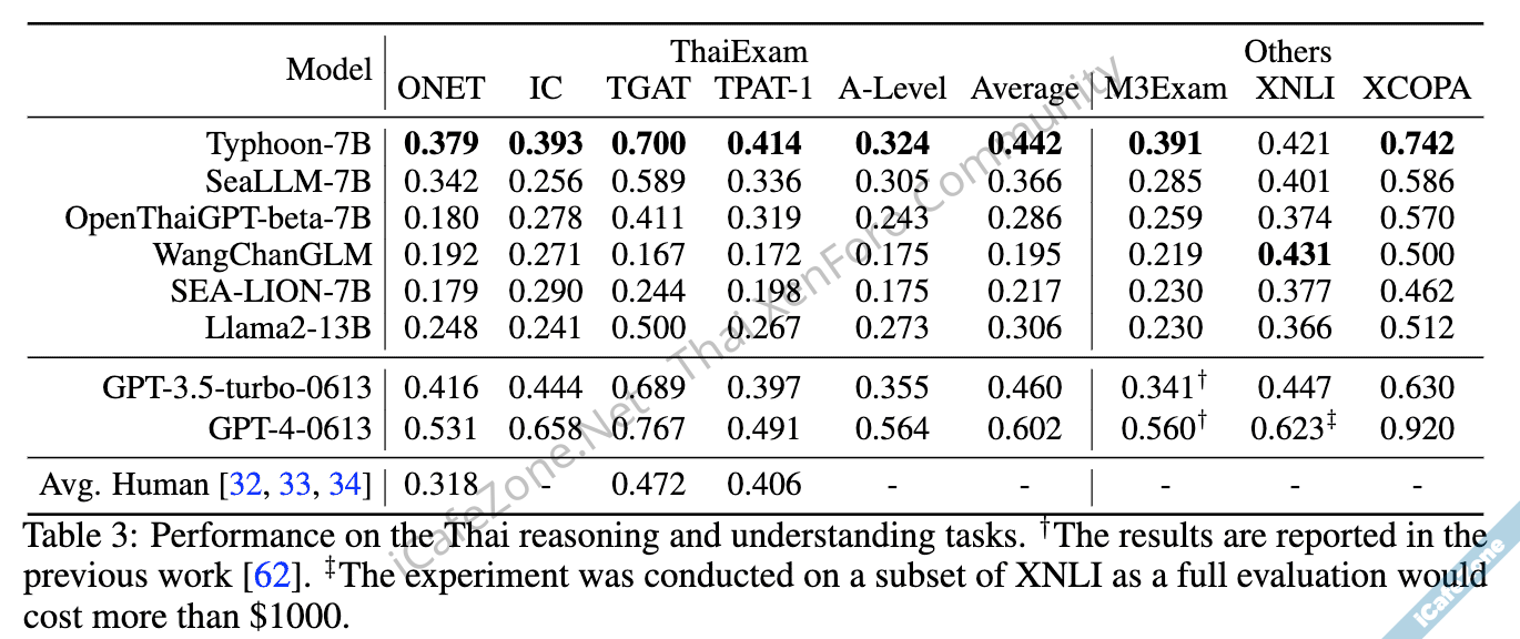 การวัดผลประสิทธิภาพของโมเดลในภาษาไทย ทาง SCB 10X ได้พัฒนาชุดทดสอบวัดผลประสิทธิภาพโมเดล LLM ภาษาไทยชื่อ ThaiExam โดยวัดด้วยข้อสอบสำหรับเด็กมัธยมศึกษาตอนปลายและข้อมูลด้านการลงทุนจากผู้เชี่ยวชาญด้านการลงทุนในประเทศไทย พบว่าประสิทธิภาพโมเดล Typhoon-7b เหนือกว่าทุกโมเดลที่ปล่อยฟรีในภาษาไทยและมีคะแนนเทียบเท่ากับ GPT-3.5
