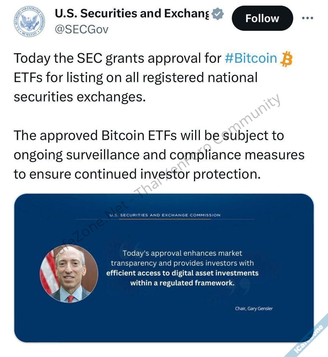บัญชี X หรือ Twitter เดิมของ SEC (@SECGov) ได้โพสต์ข้อความ SEC อนุมัติให้สามารถจัดตั้งกองทุน ETF บนสินทรัพย์อ้างอิง Bitcoin ได้แล้ว ต่อมา 30 นาที ข้อความดังกล่าวถูกลบไป และ Gary Gensler ประธาน SEC ก็โพสต์ข้อความใน X ว่า บัญชีของ SEC ถูกแฮค และมีการโพสต์ข้อความที่ไม่ถูกต้อง โดยบอกว่าตอนนี้ SEC ยังไม่ได้อนุมัติการออก Bitcoin ETF แต่อย่างใด