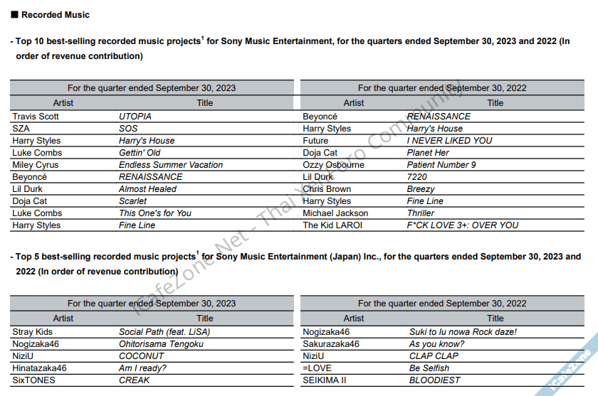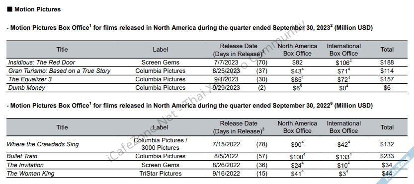 โซนี่รายงานผลประกอบการประจำไตรมาสที่ 2 ปีการเงินบริษัท 2023 สิ้นสุดเดือนกันยายน ยอดขายรวมเพิ่มขึ้น 8% จากช่วงเดียวกันในปีก่อนเป็น 2.8286 ล้านล้านเยน และมีกำไรสุทธิ 2.001 แสนล้านเยน ลดลง 29% โดยโซนี่บอกว่าภาพรวมยอดขายเติบโตจากธุรกิจเกม ภาพยนตร์ และเพลง ขณะที่กลุ่มสินค้าความบันเทิงยอดขายลดลง ส่วนกำไรนั้นกระทบจากธุรกิจเซ็นเซอร์กล้องและบริการด้านการเงิน