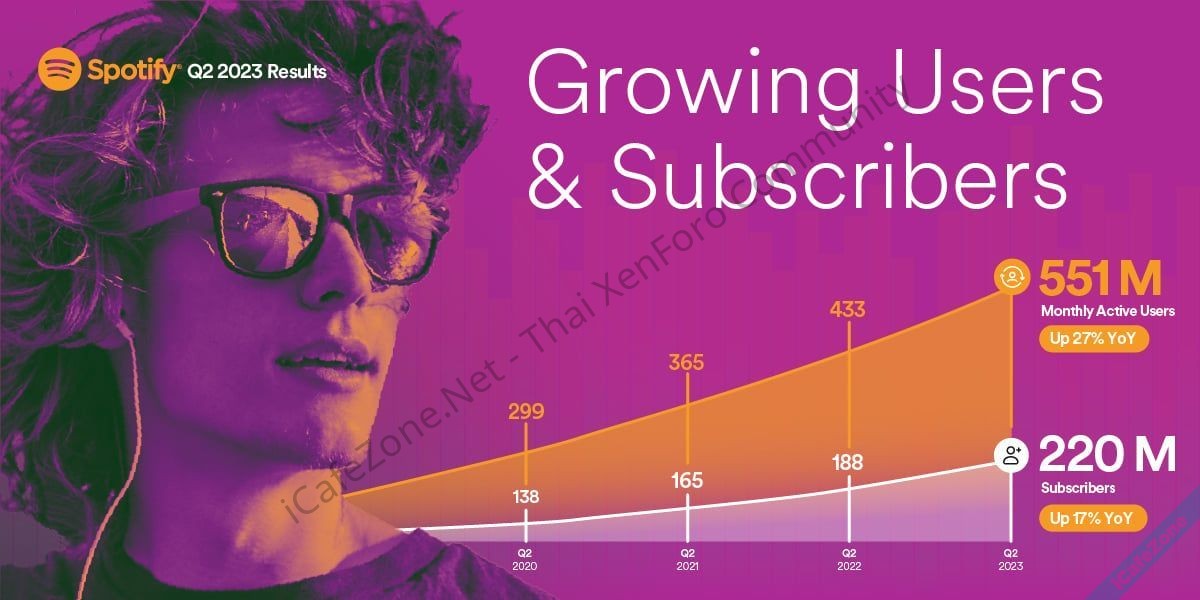 Spotify รายงานผลการดำเนินงานประจำไตรมาสที่ 2 ปี 2023 ยังคงเติบโตมากกว่าที่บริษัทประเมินไว้ โดยมีจำนวนสมาชิกรวมเพิ่มขึ้นเป็น 551 ล้านบัญชี เป็นสมาชิกแบบพรีเมียม 220 ล้านบัญชี