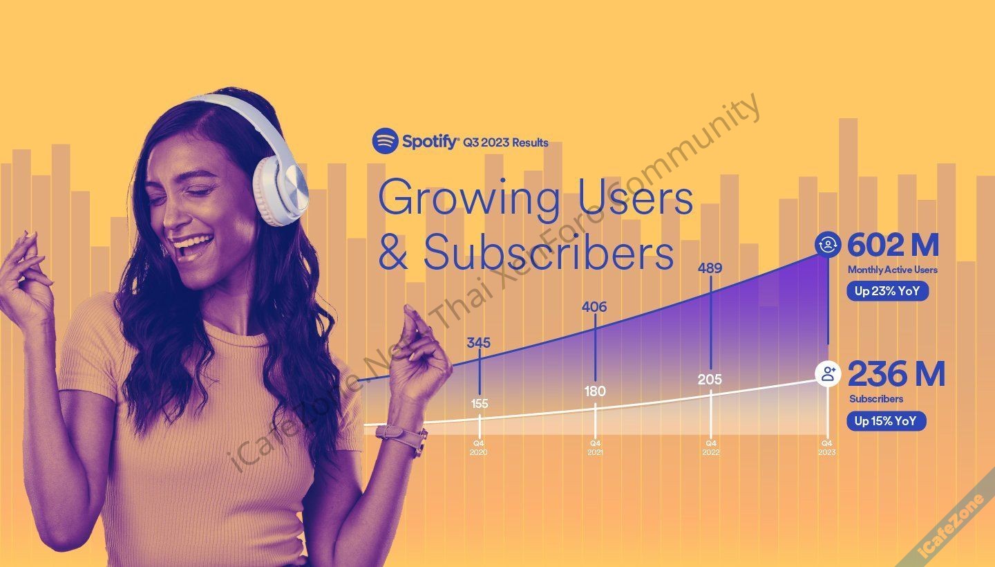 Spotify รายงานผลประกอบการของไตรมาสที่ 4 ปี 2023 จำนวนผู้ใช้งานเพิ่มขึ้น 23% เมื่อเทียบกับไตรมาสเดียวกันในปีก่อนเป็น 602 ล้านบัญชี เป็นลูกค้าพรีเมียมที่จ่ายเงิน 236 ล้านบัญชี เพิ่มขึ้น 15%