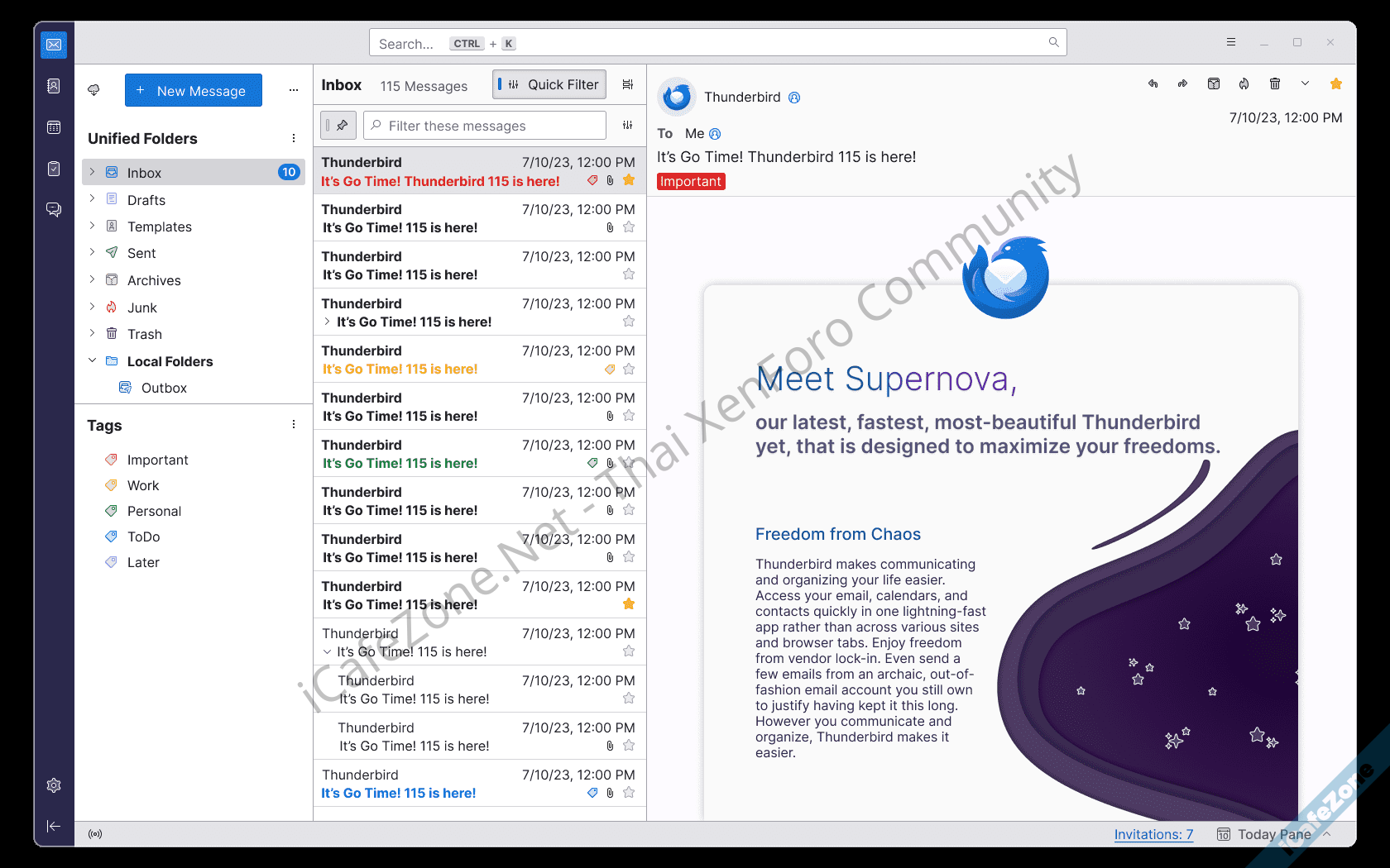 Thunderbird ออกเวอร์ชัน 115 ตามนโยบายออกรุ่นใหม่ปีละครั้ง (แต่นับเลขตาม Firefox ปีที่แล้วคือเวอร์ชัน 102) ของใหม่ที่สำคัญคือ UI ตัวใหม่ที่ชื่อ Supernova สวยงามขึ้นกว่าเดิม พร้อมเปลี่ยนโลโก้ของ Thunderbird ใหม่เพื่อสะท้อนการเข้าสู่ยุคใหม่ของซอฟต์แวร์ตัวนี้ด้วย