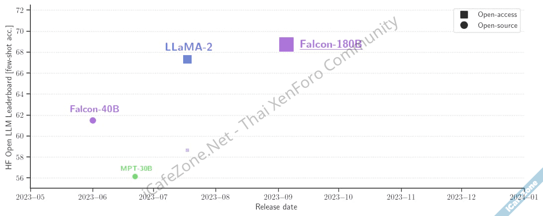 นอกจากนี้ Falcon 180B ทำคะแนนวัดผลบน Hugging Face Leaderboard ได้ 68.74 คะแนน สูงกว่า Llama 2 ขนาด 70B ที่ทำคะแนนไปได้ 67.35 และสามารถทำคะแนนได้ใกล้เคียงกับ PaLM 2 Large ของ Google