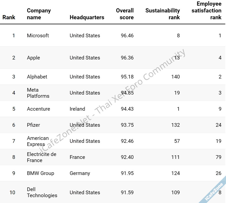ไมโครซอฟท์ได้คะแนนรวม 96.46 เอาชนะแอปเปิลที่ได้ 96.36 คะแนนไปเพียงนิดเดียว อันดับสาม Alphabet, อันดับสี่ Meta, อันดับห้า Accenture โดยไมโครซอฟท์ยังได้คะแนนความพึงพอใจของพนักงานเป็นอันดับหนึ่งด้วย