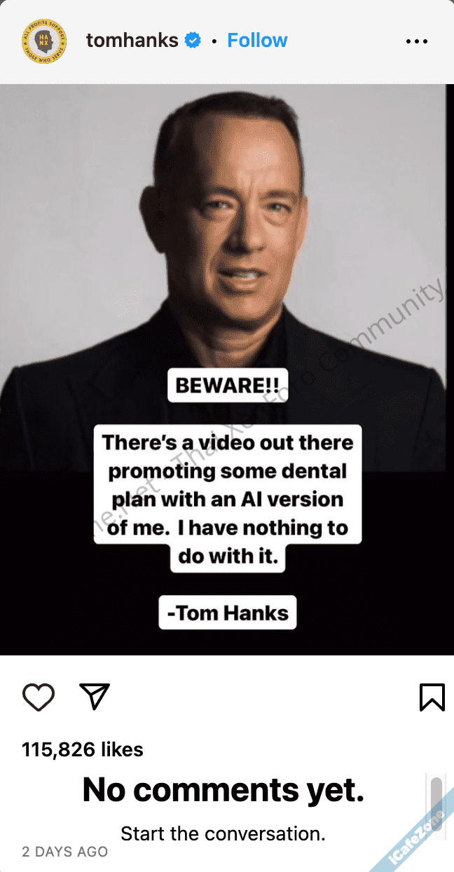 Tom Hanks โพสต์ Instagram ชี้แจงว่า มีวิดีโอโปรโมตแผนทันตกรรมสร้างด้วย AI ที่หน้าตาเหมือนเขาทุกอย่าง และเขาไม่มีส่วนเกี่ยวข้องกับมันเลย ซึ่งภาพในวิดีโอโฆษณามีความต่างเล็กน้อยตรงดูเด็กกว่าแต่ยังไม่แน่ชัดว่าโฆษณามีจุดประสงค์อะไรหรือบริษัทใดเป็นคนทำ