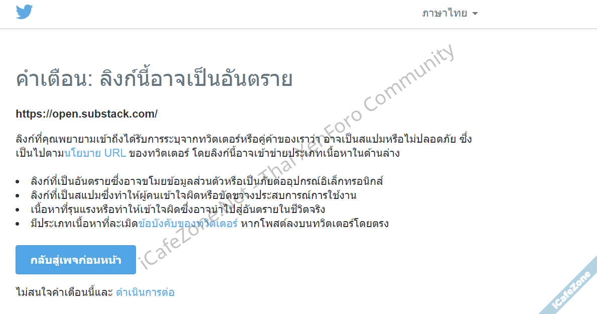 ตัวอย่างทวีตที่เกิดปัญหา ไม่สามารถโต้ตอบได้เมื่อมีลิงก์ไป Substack