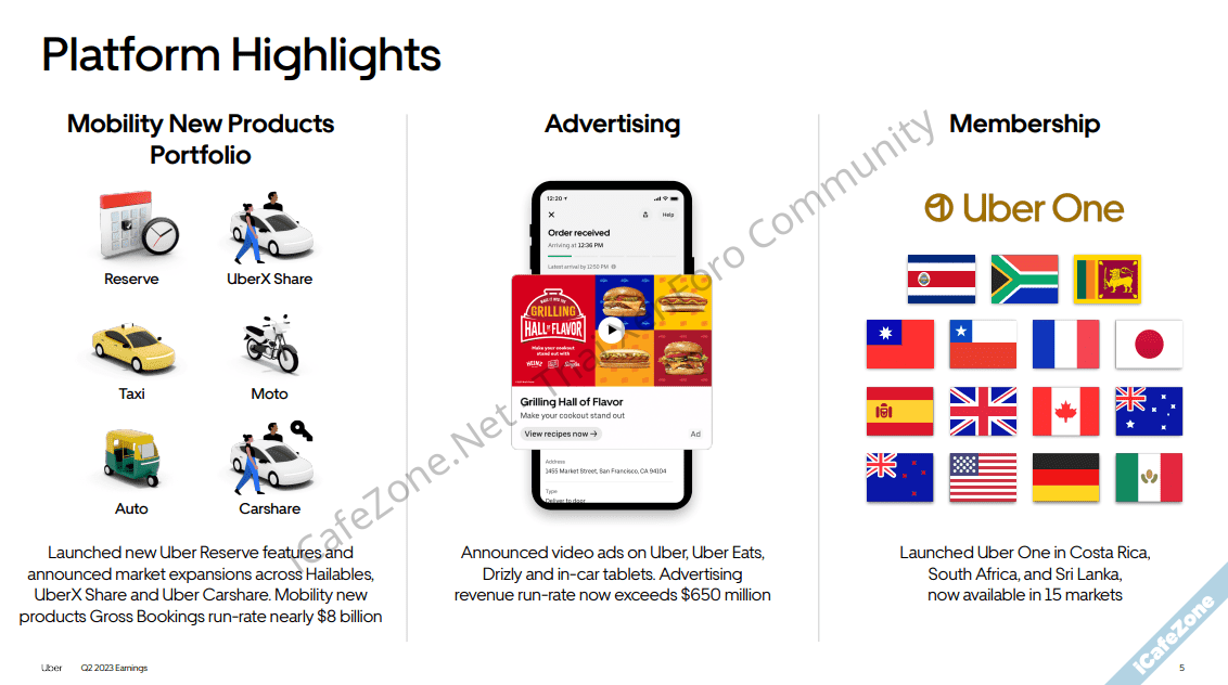 Uber ผู้ให้บริการแพลตฟอร์มเรียกรถและส่งอาหารรายใหญ่ รายงานผลการดำเนินงานประจำไตรมาสที่ 2 ของปี 2023 มีปริมาณการจ่ายเงินรวมบนแพลตฟอร์ม (Gross Booking) เพิ่มขึ้น 16% จากช่วงเดียวกันในปีก่อนเป็น 33,601 ล้านดอลลาร์ แบ่งเป็น บริการรถโดยสาร 16,728 ล้านดอลลาร์ เพิ่มขึ้น 25% และบริการเดลิเวอรี 15,595 ล้านดอลลาร์ เพิ่มขึ้น 12%