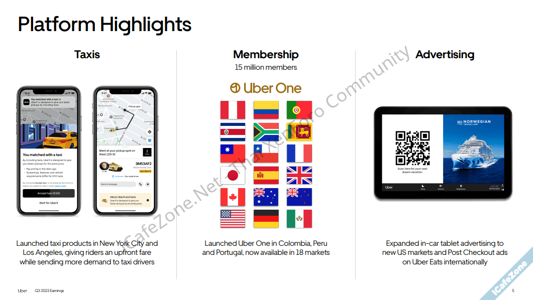 Uber รายงานผลประกอบการของไตรมาสที่ 3 ปี 2023 โดย Gross Bookings หรือปริมาณเงินที่มีการใช้จ่ายบนแพลตฟอร์มรวมเพิ่มขึ้น 21% จากช่วงเดียวกันในปีก่อนเป็น 35,281 ล้านดอลลาร์ คิดเป็นรายได้ของ Uber 9,292 ล้านดอลลาร์ เพิ่มขึ้น 11% มีกำไรจากการดำเนินงาน 394 ล้านดอลลาร์ และมีกำไรสุทธิ 221 ล้านดอลลาร์